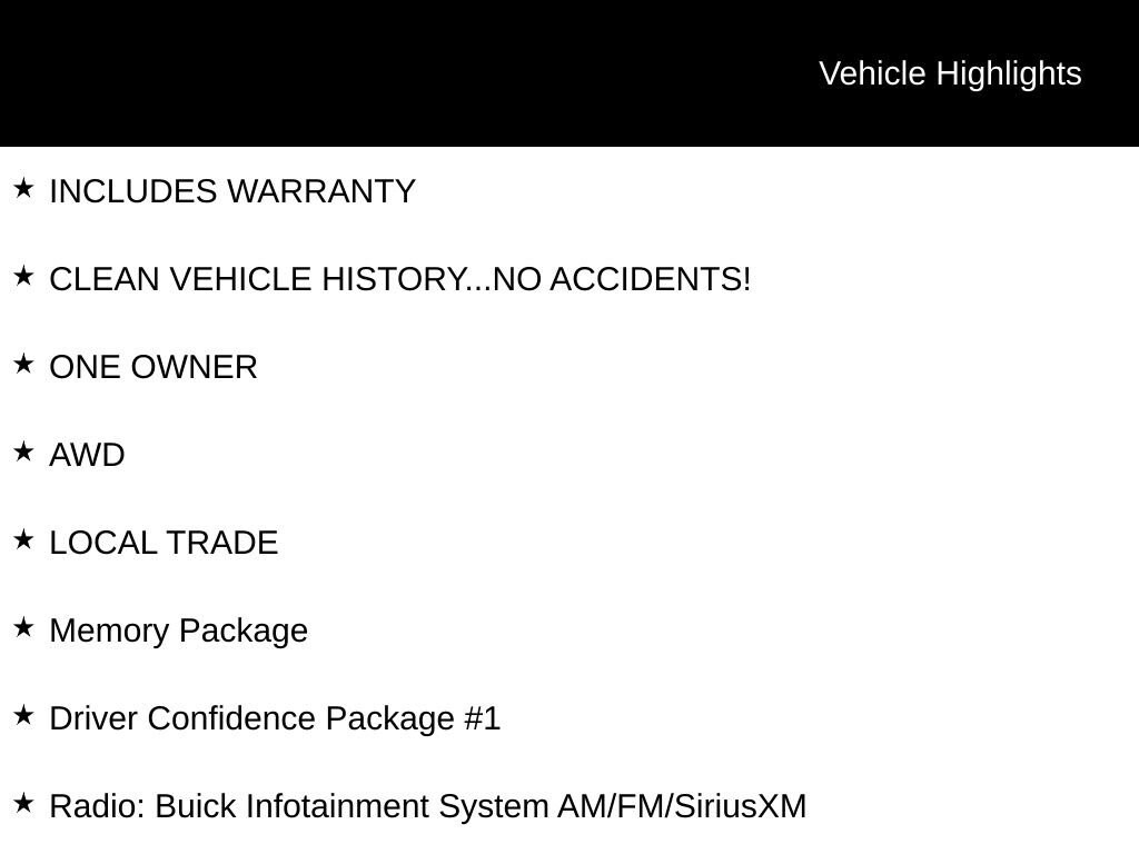 INCLUDES WARRANTY, CLEAN VEHICLE HISTORY...NO ACCIDENTS!, ONE OWNER, AWD, LOCAL TRADE, 4-Way Power Driver Lumbar Seat Adjuster, 4-Way Power Front Passenger Lumbar Seat Adjuster, Automatic Headlamp Leveling System, Automatic temperature control, Cornering Lamps, Driver Confidence Package #1, Enhanced Speaker Audio System Feature, Lane Change Alert w/Side Blind Zone Alert, LED Headlamps, Memory Package, Power-Adjustable Heated Outside Mirrors, Radio: Buick Infotainment System AM/FM/SiriusXM, Rear Cross-Traffic Alert, Rear Storage Area Cargo Management, SiriusXM Satellite Radio, Ultrasonic Rear Park Assist w/Audible Warning, Wireless Charging.