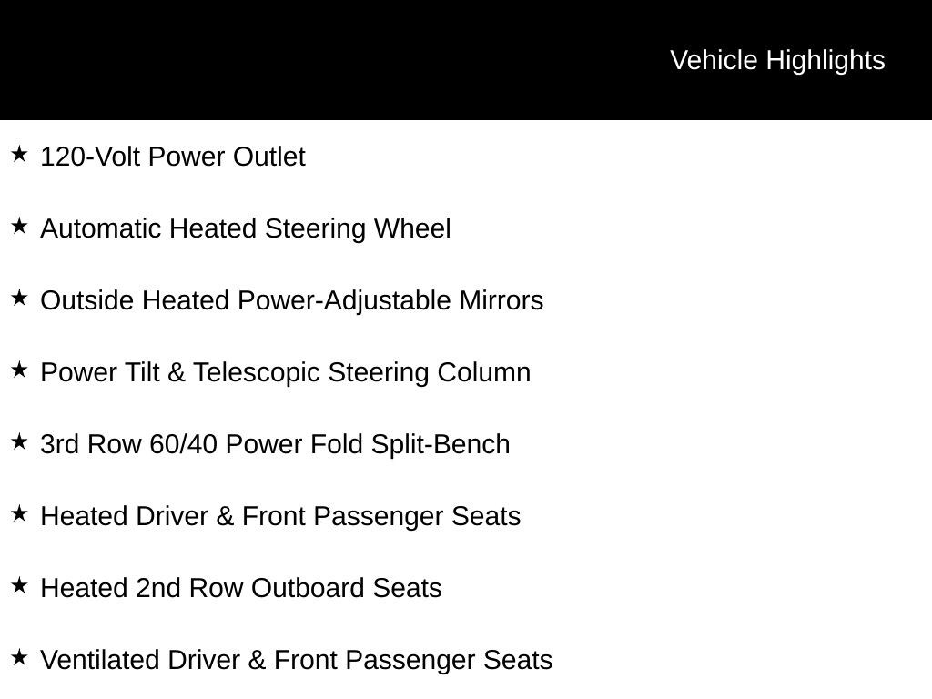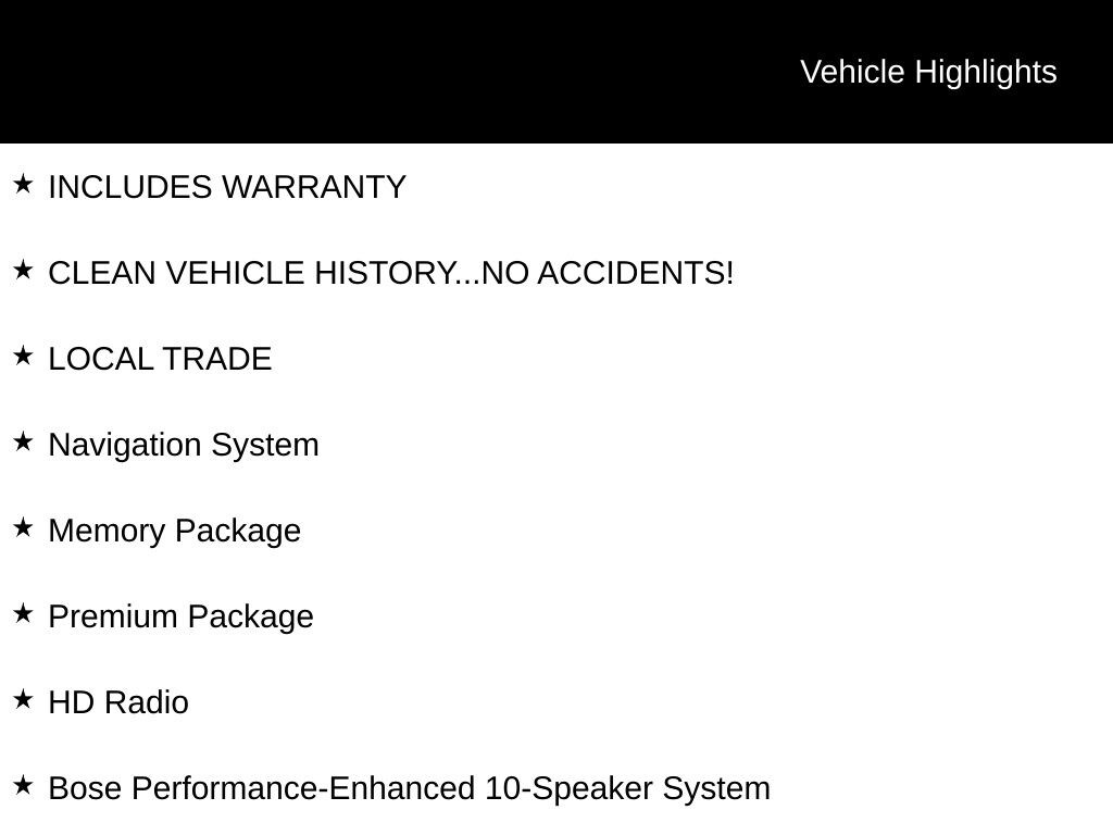 INCLUDES WARRANTY, CLEAN VEHICLE HISTORY...NO ACCIDENTS!, LOCAL TRADE, 120-Volt Power Outlet, 3rd Row 60/40 Power Fold Split-Bench, Automatic Heated Steering Wheel, Bose Performance-Enhanced 10-Speaker System, HD Radio, Heated 2nd Row Outboard Seats, Heated Driver & Front Passenger Seats, Memory Package, Navigation System, Outside Heated Power-Adjustable Mirrors, Power Tilt & Telescopic Steering Column, Premium Package, Ventilated Driver & Front Passenger Seats.