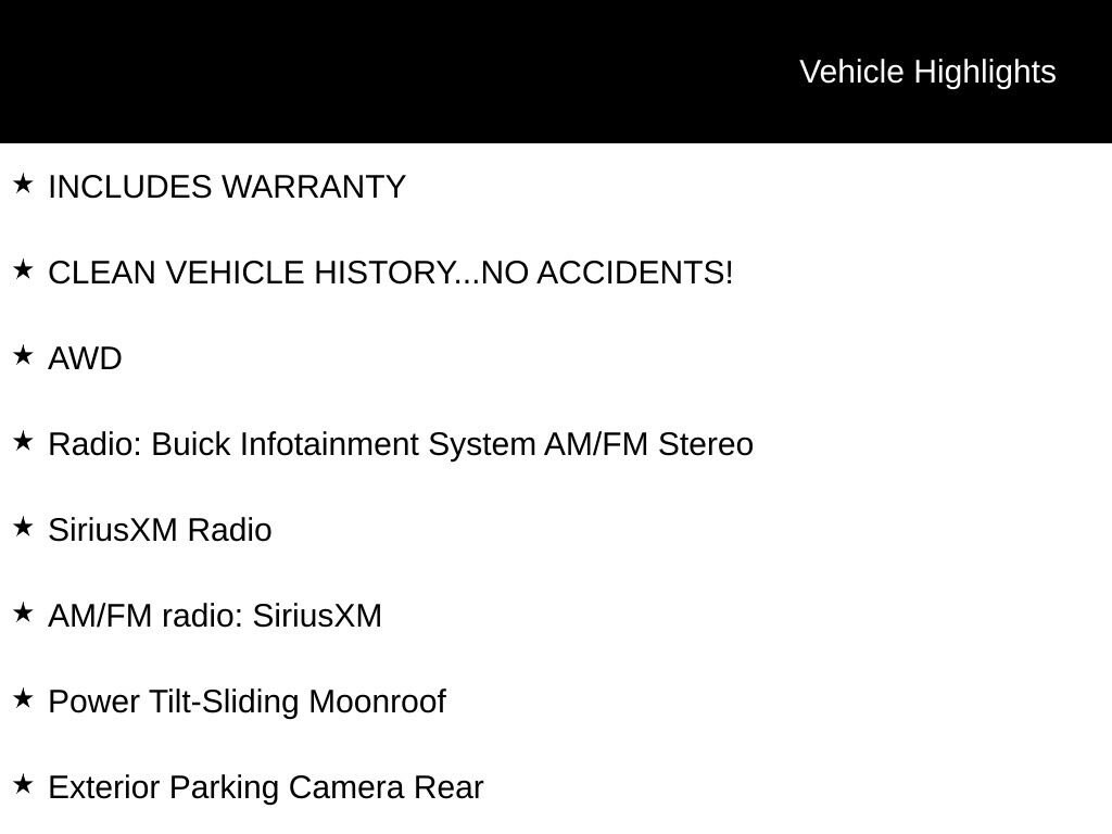 INCLUDES WARRANTY, CLEAN VEHICLE HISTORY...NO ACCIDENTS!, AWD, 18 Aluminum Wheels, 6-Way Power Driver Seat Adjuster, AM/FM radio: SiriusXM, Apple CarPlay/Android Auto, Exterior Parking Camera Rear, Heated Driver & Front Passenger Seats, Leather-Appointed Seat Trim, Power Tilt-Sliding Moonroof, Radio: Buick Infotainment System AM/FM Stereo, SiriusXM Radio.