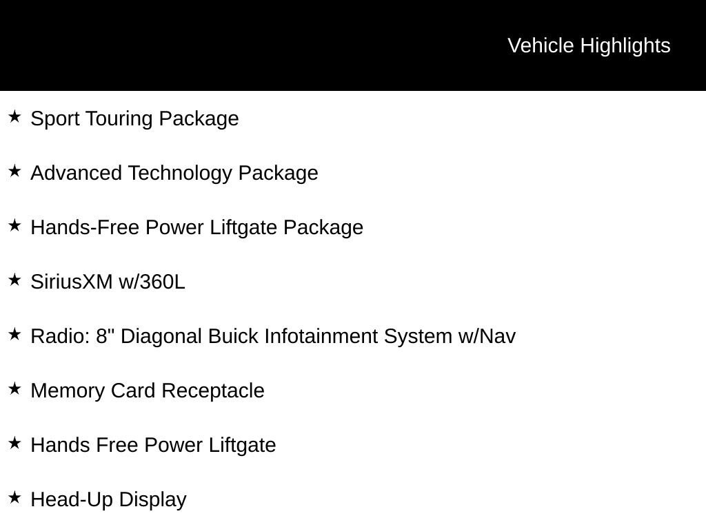 INCLUDES LIFETIME POWERTRAIN WARRANTY, REMAINDER OF FACTORY WARRANTY, CLEAN VEHICLE HISTORY...NO ACCIDENTS!, ONE OWNER, AWD, LOCAL TRADE, 18 Aluminum Wheels, Adaptive Cruise Control - Camera, Advanced Technology Package, Automatic Parking Assist w/Braking, Black Exterior Mirror Caps, Black Roof Package, Black Roof Panel, Black Roof Rails, Body Color Rocker Moldings, Body-Color Bodyside Moldings, Convenience Package, Custom Grille, Front Intermittent RainSense Wipers, Hands Free Power Liftgate, Hands-Free Power Liftgate Package, HD Surround Vision, Head-Up Display, Memory Card Receptacle, Radio: 8 Diagonal Buick Infotainment System w/Nav, Rear Camera Mirror, Rear Camera Mirror Washer, Rear Park Assist, Red Front & Rear Bumper Protective Molding, SiriusXM w/360L, Sport Front Bumper, Sport Rear Bumper, Sport Touring Badge, Sport Touring Package, Wireless Charging.