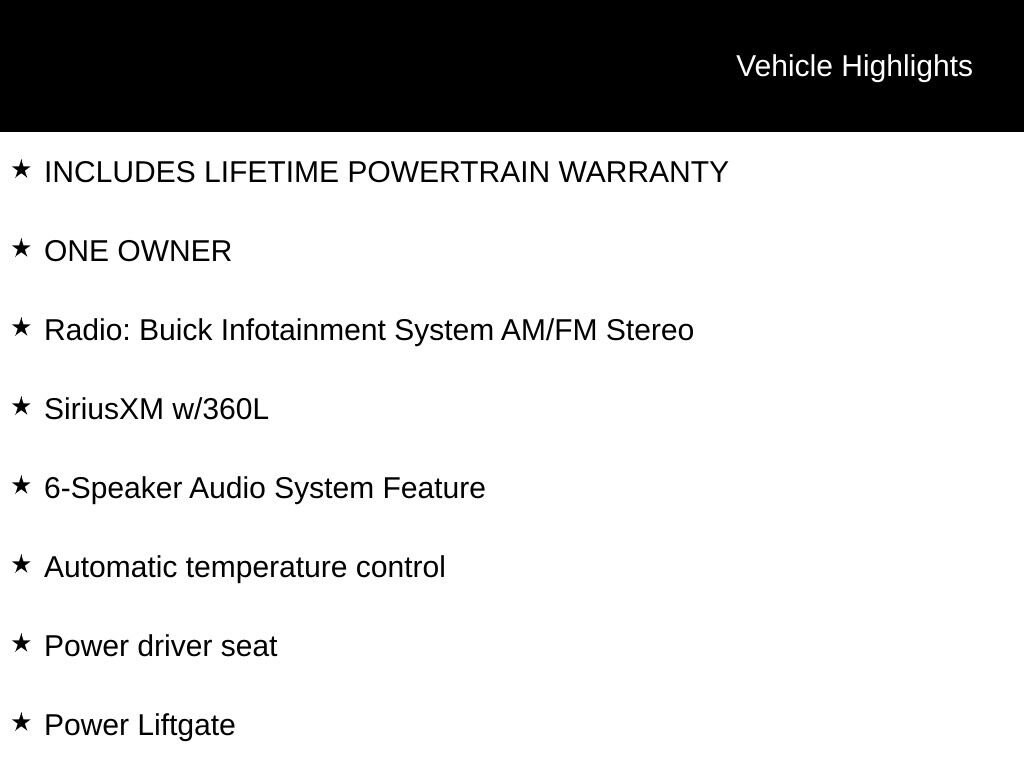 INCLUDES LIFETIME POWERTRAIN WARRANTY, ONE OWNER, 6-Speaker Audio System Feature, Apple CarPlay/Android Auto, Automatic temperature control, Heated Driver & Front Passenger Seats, Perforated Leather-Appointed Seat Trim, Power driver seat, Power Liftgate, Radio: Buick Infotainment System AM/FM Stereo, SiriusXM w/360L.