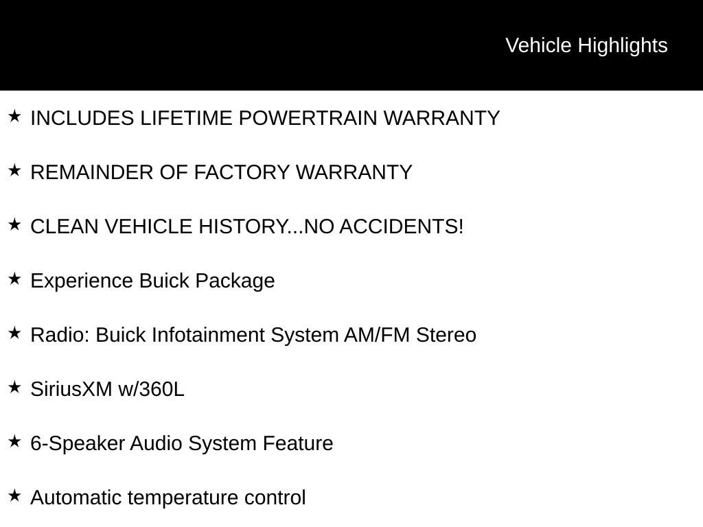 INCLUDES LIFETIME POWERTRAIN WARRANTY, REMAINDER OF FACTORY WARRANTY, CLEAN VEHICLE HISTORY...NO ACCIDENTS!, 20 Polished Aluminum Wheels, 6-Speaker Audio System Feature, 8-Way Power Driver Seat Adjuster, Automatic temperature control, Experience Buick Package, Front Power Sliding Moonroof, Heated Driver & Front Passenger Seats, Heated Steering Wheel, Perforated Leather-Appointed Seat Trim, Power Liftgate, Radio: Buick Infotainment System AM/FM Stereo, SiriusXM w/360L, Wireless Apple CarPlay/Wireless Android Auto.Recent Arrival! 18/26 City/Highway MPG Odometer is 23196 miles below market average!For over 50 years, Tom Ahl has been committed to earning your business, trust and friendship by providing you with the greatest value in a vehicle for the lowest cost to you. We offer full disclosure with every vehicle by providing a complimentary Autocheck vehicle history report and a copy of repairs made following our extensive 72 point inspection. For a deal so good it'll knock your socks off, visit Tom Ahl's today!