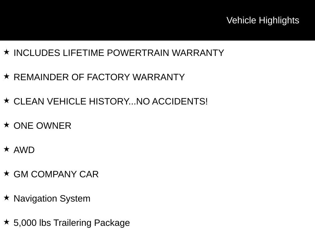 INCLUDES LIFETIME POWERTRAIN WARRANTY, REMAINDER OF FACTORY WARRANTY, CLEAN VEHICLE HISTORY...NO ACCIDENTS!, ONE OWNER, AWD, GM COMPANY CAR, 2nd Row 1-Touch Flat Folding Seat, 3rd Row 60/40 Power Split-Folding Bench, 5,000 lbs Trailering Package, AM/FM radio: SiriusXM with 360L, Automatic temperature control, Bose Premium 12-Speaker Audio System, Driver Attention Assist, Enhanced Automatic Parking Assist, Head-Up Display, Heated Driver and Front Passenger Seats, Heated steering wheel, Heated Wiper Park, Hitch Guidance, Hitch View with Pan/Zoom/Tilt Image Adjustment, Leatherette Seat Trim, Memory Settings, Navigation System, Power Liftgate, Power Package, Power Panoramic Sunroof with Sunshade, Radio: Infotainment Center, Super Cruise, Super Cruise Package, Wheels: 20 Alloy with Medium Android Finish, Wireless Apple CarPlay, Wireless Google Android Auto.