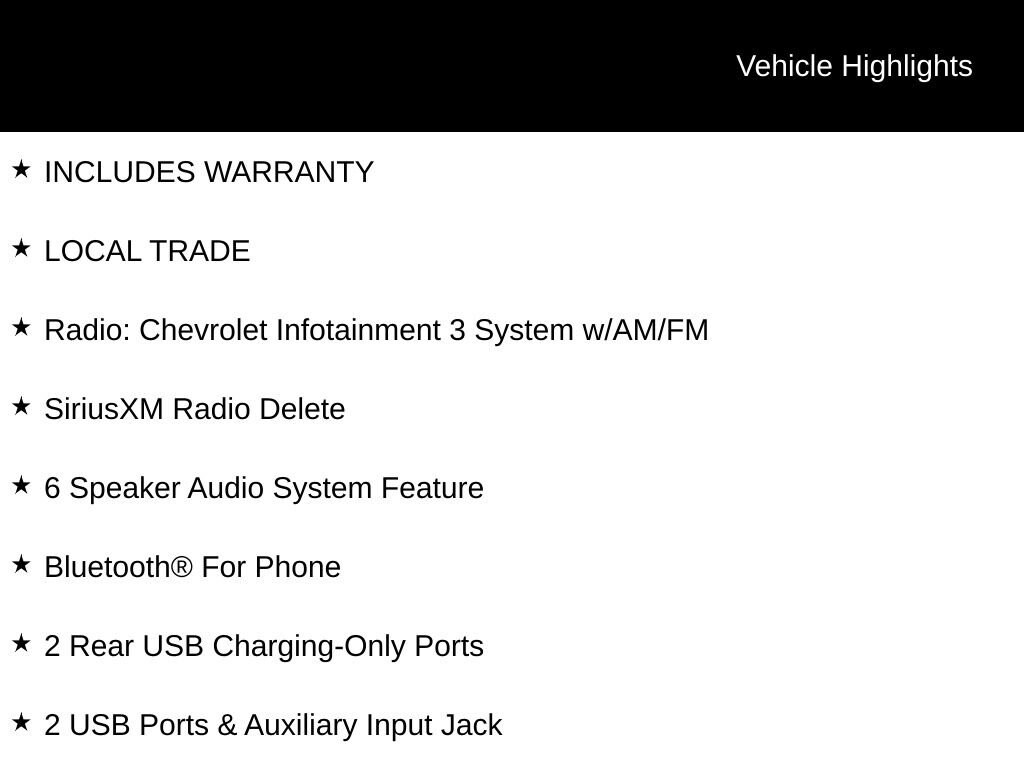 INCLUDES WARRANTY, LOCAL TRADE, 2 Rear USB Charging-Only Ports, 2 USB Ports & Auxiliary Input Jack, 6 Speaker Audio System Feature, Bluetooth® For Phone, Radio: Chevrolet Infotainment 3 System w/AM/FM, SiriusXM Radio Delete.Recent Arrival! 26/32 City/Highway MPGFor over 50 years, Tom Ahl has been committed to earning your business, trust and friendship by providing you with the greatest value in a vehicle for the lowest cost to you. We offer full disclosure with every vehicle by providing a complimentary Autocheck vehicle history report and a copy of repairs made following our extensive 72 point inspection. For a deal so good it'll knock your socks off, visit Tom Ahl's today!