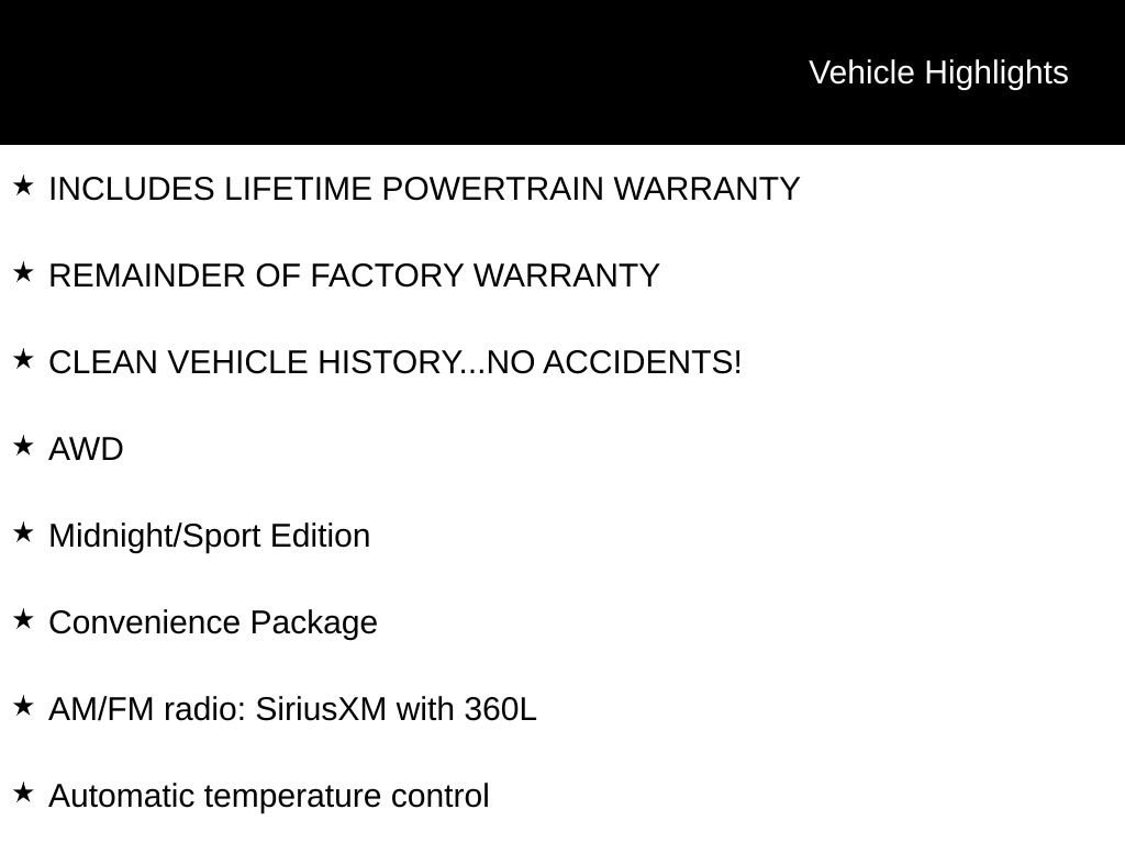 INCLUDES LIFETIME POWERTRAIN WARRANTY, REMAINDER OF FACTORY WARRANTY, CLEAN VEHICLE HISTORY...NO ACCIDENTS!, AWD, 8-Way Power Driver Seat Adjuster, Adaptive Cruise Control, AM/FM radio: SiriusXM with 360L, Automatic temperature control, Black Roof-Mounted Side Rails, Convenience Package, Enhanced Automatic Emergency Braking, Front & Rear Black Bowties, Heated Driver & Front Passenger Seats, Inside Rear-View Auto-Dimming Mirror, Midnight/Sport Edition, Rear Power Programmable Liftgate, Wheels: 18 High Gloss Black Painted Aluminum, Wireless Charging.