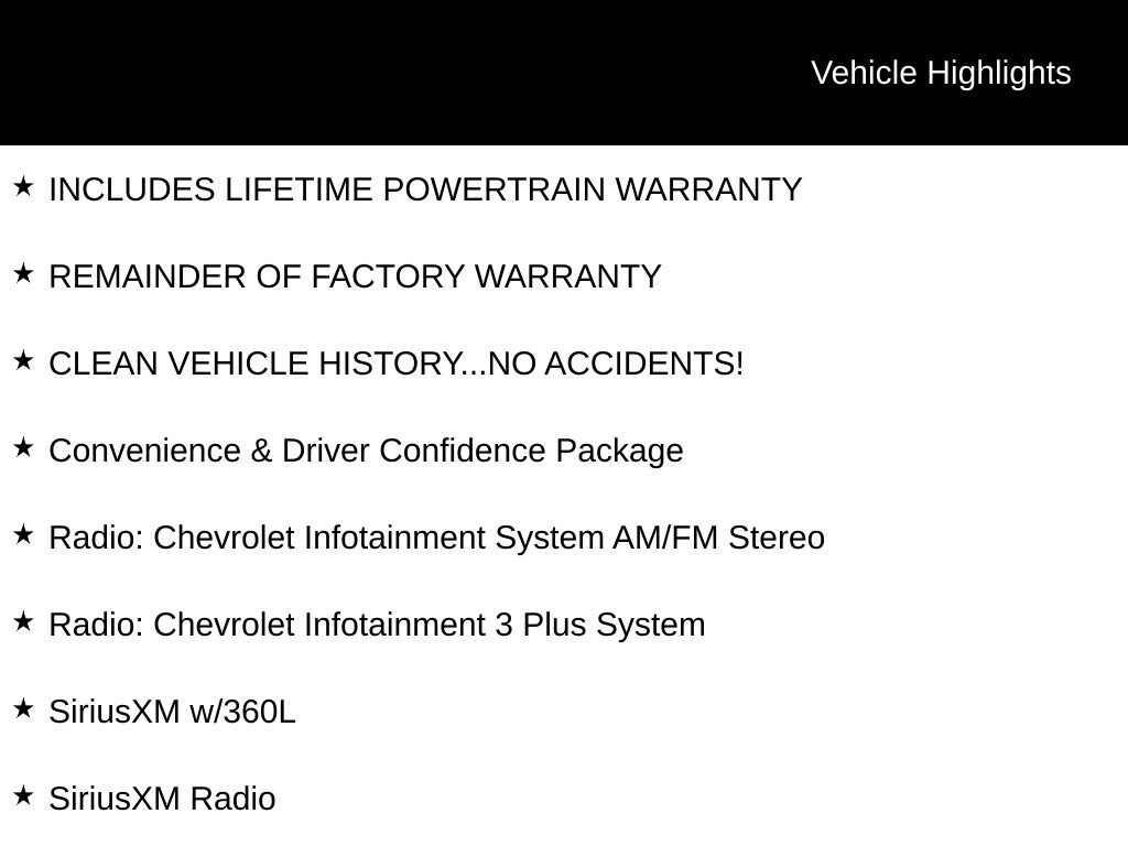 INCLUDES LIFETIME POWERTRAIN WARRANTY, REMAINDER OF FACTORY WARRANTY, CLEAN VEHICLE HISTORY...NO ACCIDENTS!, 4.2 Multi-Color Enhanced Driver Instrument Display, 6-Speaker Audio System Feature, 8-Way Power Driver Seat Adjuster, Apple CarPlay/Android Auto, Automatic temperature control, Convenience & Driver Confidence Package, Exterior Parking Camera Rear, Heated Driver & Front Passenger Seats, Radio: Chevrolet Infotainment 3 Plus System, Radio: Chevrolet Infotainment System AM/FM Stereo, Rear Power Liftgate, Remote Start, SiriusXM Radio, SiriusXM w/360L, Wheels: 18 Bright Silver-Painted Aluminum.Recent Arrival! 18/27 City/Highway MPGFor over 50 years, Tom Ahl has been committed to earning your business, trust and friendship by providing you with the greatest value in a vehicle for the lowest cost to you. We offer full disclosure with every vehicle by providing a complimentary Autocheck vehicle history report and a copy of repairs made following our extensive 72 point inspection. For a deal so good it'll knock your socks off, visit Tom Ahl's today!