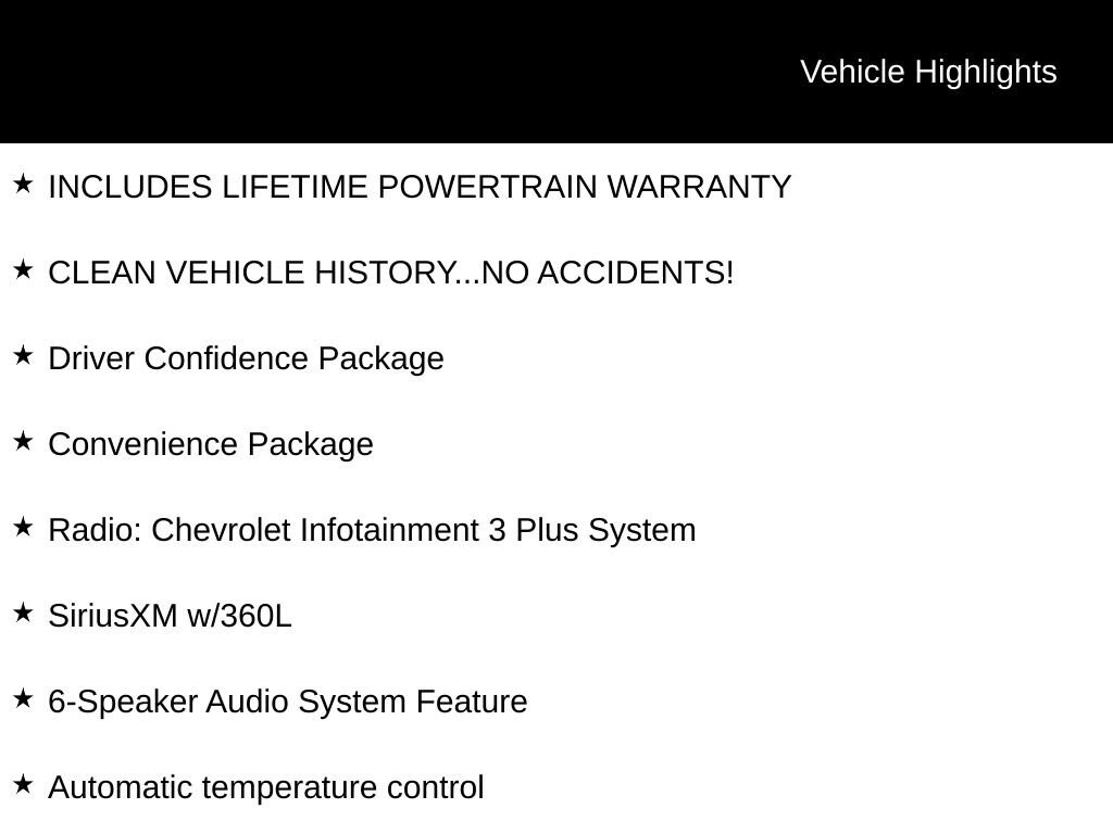 INCLUDES LIFETIME POWERTRAIN WARRANTY, CLEAN VEHICLE HISTORY...NO ACCIDENTS!, 6-Speaker Audio System Feature, 8-Way Power Driver Seat Adjuster, Adaptive Cruise Control, Automatic temperature control, Black Roof-Mounted Side Rails, Convenience Package, Driver Confidence Package, Enhanced Automatic Emergency Braking, Inside Rear-View Auto-Dimming Mirror, Lane Change Alert w/Side Blind Zone Alert, Radio: Chevrolet Infotainment 3 Plus System, Rear Cross Traffic Alert, Rear Park Assist w/Audible Warning, Rear Power Programmable Liftgate, SiriusXM w/360L, Wireless Charging.Recent Arrival! 22/29 City/Highway MPGFor over 50 years, Tom Ahl has been committed to earning your business, trust and friendship by providing you with the greatest value in a vehicle for the lowest cost to you. We offer full disclosure with every vehicle by providing a complimentary Autocheck vehicle history report and a copy of repairs made following our extensive 72 point inspection. For a deal so good it'll knock your socks off, visit Tom Ahl's today!