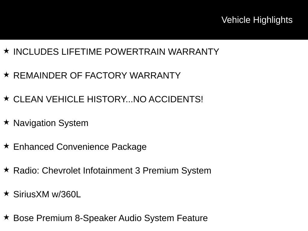 INCLUDES LIFETIME POWERTRAIN WARRANTY, REMAINDER OF FACTORY WARRANTY, CLEAN VEHICLE HISTORY...NO ACCIDENTS!, 3.6L V6 SIDI, 8-Way Power Driver Seat Adjuster, Apple CarPlay/Android Auto, Automatic temperature control, Bose Premium 8-Speaker Audio System Feature, Enhanced Convenience Package, Heated Driver & Front Passenger Seats, Heated Rear Outboard Seating Positions, Memory Settings For Driver Seat & Exterior Mirrors, Navigation System, Perforated Leather-Appointed Seat Trim, Power Liftgate, Power Tilt & Telescoping Steering Column, Radio: Chevrolet Infotainment 3 Premium System, SiriusXM w/360L, Ventilated Driver & Front Passenger Seats, Wheels: 20 Gloss Black Aluminum.