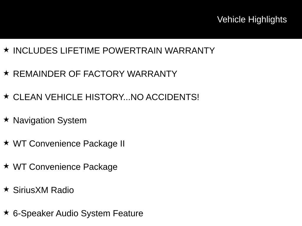 Priced below KBB Fair Purchase Price! INCLUDES LIFETIME POWERTRAIN WARRANTY, REMAINDER OF FACTORY WARRANTY, CLEAN VEHICLE HISTORY...NO ACCIDENTS!, 6-Speaker Audio System Feature, 8-Way Power Driver Seat Adjuster, Electronic Automatic Cruise Control, EZ-Lift & Lower Tailgate, Front Floor Console Compartment w/Cup Holders, Manual Rear-Sliding Window, Navigation System, Power Driver Lumbar Control Seat Adjuster, Radio: 11.3 Diagonal Advanced Color LCD Display, Remote Locking Tailgate, SiriusXM Radio, Steering Wheel Mounted Audio Controls, StowFlex Tailgate Storage Compartment, Tailgate Keyed Cylinder Lock, Wireless Phone Projection, WT Convenience Package, WT Convenience Package II.Recent Arrival! Odometer is 2229 miles below market average!For over 50 years, Tom Ahl has been committed to earning your business, trust and friendship by providing you with the greatest value in a vehicle for the lowest cost to you. We offer full disclosure with every vehicle by providing a complimentary Autocheck vehicle history report and a copy of repairs made following our extensive 72 point inspection. For a deal so good it'll knock your socks off, visit Tom Ahl's today!