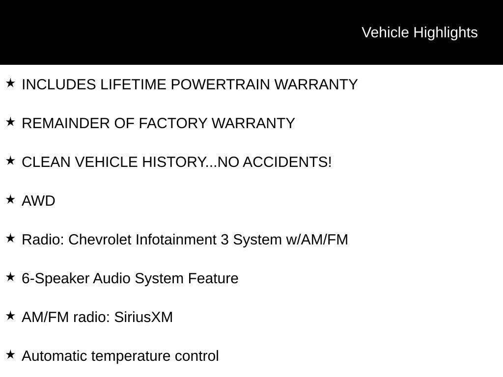 INCLUDES LIFETIME POWERTRAIN WARRANTY, REMAINDER OF FACTORY WARRANTY, CLEAN VEHICLE HISTORY...NO ACCIDENTS!, AWD, 6-Speaker Audio System Feature, AM/FM radio: SiriusXM, Automatic temperature control, Bluetooth® For Phone, Heated Driver & Front Passenger Seats, Power Liftgate, Radio: Chevrolet Infotainment 3 System w/AM/FM.Recent Arrival! 24/30 City/Highway MPG Odometer is 4453 miles below market average!For over 50 years, Tom Ahl has been committed to earning your business, trust and friendship by providing you with the greatest value in a vehicle for the lowest cost to you. We offer full disclosure with every vehicle by providing a complimentary Autocheck vehicle history report and a copy of repairs made following our extensive 72 point inspection. For a deal so good it'll knock your socks off, visit Tom Ahl's today!