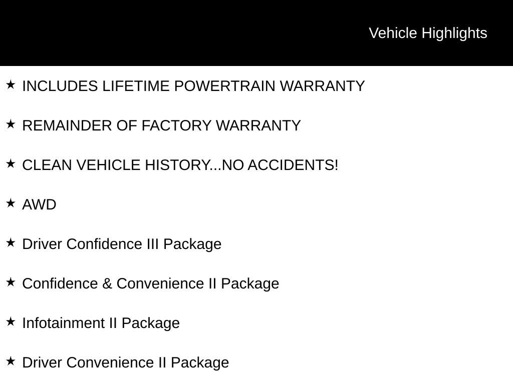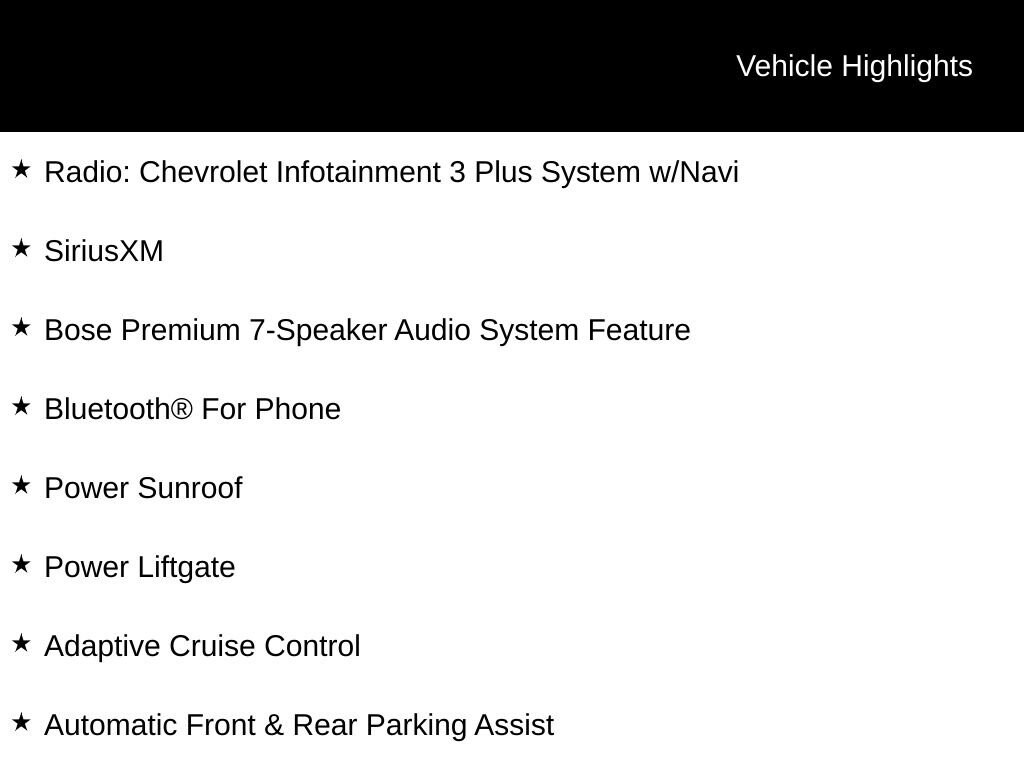 INCLUDES LIFETIME POWERTRAIN WARRANTY, REMAINDER OF FACTORY WARRANTY, CLEAN VEHICLE HISTORY...NO ACCIDENTS!, AWD, Adaptive Cruise Control, Automatic Front & Rear Parking Assist, Bluetooth® For Phone, Bose Premium 7-Speaker Audio System Feature, Confidence & Convenience II Package, Driver 8-Way Power Seat Adjuster, Driver Confidence III Package, Driver Convenience II Package, HD Surround Vision, Heated Driver & Front Passenger Seats, Heated Rear Outboard Seating Positions, Heated steering wheel, Infotainment II Package, Perforated Leather-Appointed Seat Trim, Power Liftgate, Power Sunroof, Radio: Chevrolet Infotainment 3 Plus System w/Navi, SiriusXM, Ventilated Driver Seat, Ventilated Front Passenger Seat.Recent Arrival! 24/30 City/Highway MPGFor over 50 years, Tom Ahl has been committed to earning your business, trust and friendship by providing you with the greatest value in a vehicle for the lowest cost to you. We offer full disclosure with every vehicle by providing a complimentary Autocheck vehicle history report and a copy of repairs made following our extensive 72 point inspection. For a deal so good it'll knock your socks off, visit Tom Ahl's today!