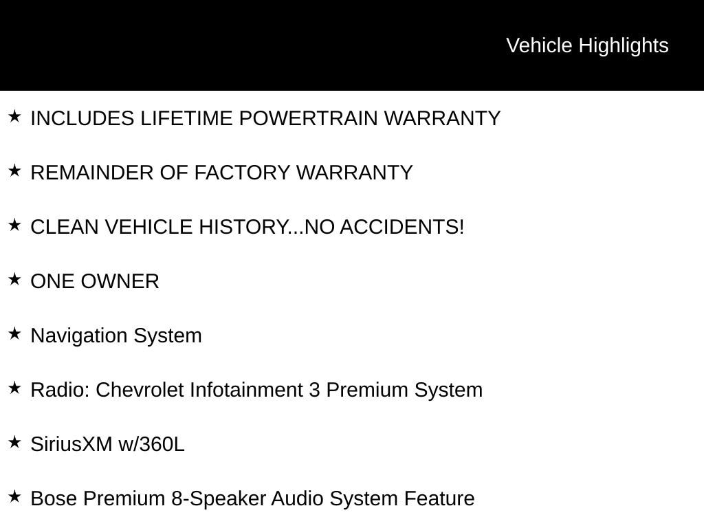 INCLUDES LIFETIME POWERTRAIN WARRANTY, REMAINDER OF FACTORY WARRANTY, CLEAN VEHICLE HISTORY...NO ACCIDENTS!, ONE OWNER, 3.6L V6 SIDI, 8-Way Power Driver Seat Adjuster, Apple CarPlay/Android Auto, Automatic temperature control, Bose Premium 8-Speaker Audio System Feature, Heated Driver & Front Passenger Seats, Navigation System, Perforated Leather-Appointed Seat Trim, Power Liftgate, Radio: Chevrolet Infotainment 3 Premium System, SiriusXM w/360L, Wheels: 20 Technical Gray Aluminum.Recent Arrival! 19/26 City/Highway MPGFor over 50 years, Tom Ahl has been committed to earning your business, trust and friendship by providing you with the greatest value in a vehicle for the lowest cost to you. We offer full disclosure with every vehicle by providing a complimentary Autocheck vehicle history report and a copy of repairs made following our extensive 72 point inspection. For a deal so good it'll knock your socks off, visit Tom Ahl's today!