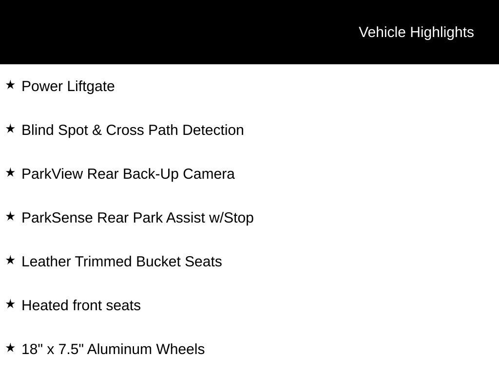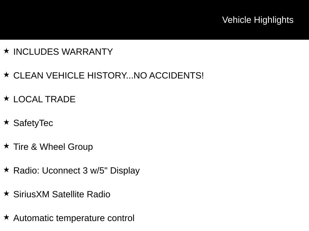 INCLUDES WARRANTY, CLEAN VEHICLE HISTORY...NO ACCIDENTS!, LOCAL TRADE, 18" x 7.5" Aluminum Wheels, Automatic temperature control, Blind Spot & Cross Path Detection, Heated front seats, Leather Trimmed Bucket Seats, ParkSense Rear Park Assist w/Stop, ParkView Rear Back-Up Camera, Power Liftgate, Radio: Uconnect 3 w/5" Display, SafetyTec, SiriusXM Satellite Radio, Tire & Wheel Group.