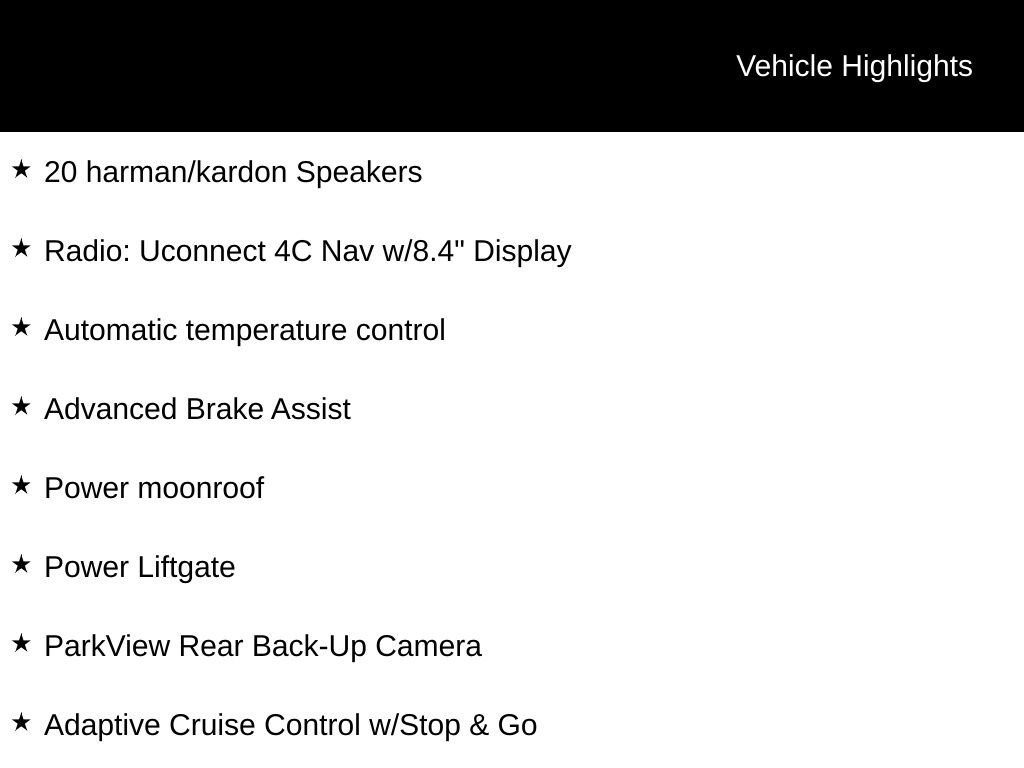 INCLUDES WARRANTY, 20 harman/kardon Speakers, 20 Speaker harman/kardon Sound Group, 20" x 7.5" Aluminum Wheels, 360 Surround View Camera System, 7 & 4 Pin Trailer Tow Wiring Harness, 760 Watt Amplifier, Adaptive Cruise Control w/Stop & Go, Advanced Brake Assist, Advanced SafetyTec Group, Automatic High Beam Headlamp Control, Automatic temperature control, Blu-Ray/DVD Player/USB Port, Full Speed Forward Collision Warning Plus, Heated front seats, Heated rear seats, High Definition Multimedia Interface, Hitch w/2" Receiver, Lane Departure Warning Plus, Navigation System, Parallel & Perp Park Assist w/Stop, ParkSense Front/Rear Park Assist w/Stop, ParkView Rear Back-Up Camera, Power Liftgate, Power moonroof, Radio: Uconnect 4C Nav w/8.4" Display, Rain Sensitive Windshield Wipers, Seatback Video Screens, Tire & Wheel Group, Trailer Sway Damping, Trailer Tow Group - 3,600 lb Rating, Uconnect Theater w/Streaming, Ventilated front seats, Video USB Port.