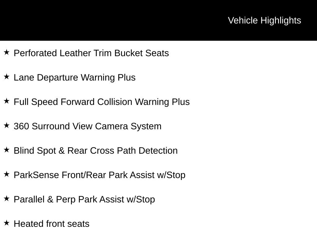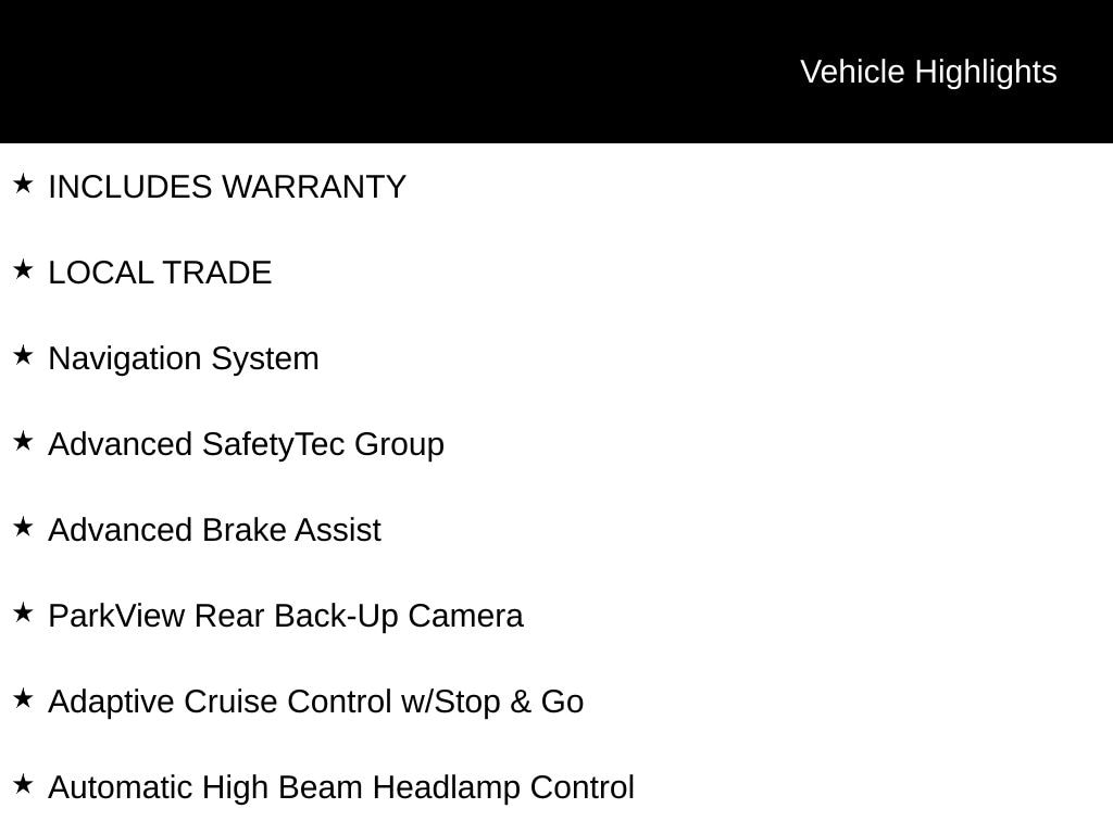 INCLUDES WARRANTY, LOCAL TRADE, 360 Surround View Camera System, Adaptive Cruise Control w/Stop & Go, Advanced Brake Assist, Advanced SafetyTec Group, Automatic High Beam Headlamp Control, Blind Spot & Rear Cross Path Detection, Full Speed Forward Collision Warning Plus, Heated front seats, Heated rear seats, Lane Departure Warning Plus, Navigation System, Parallel & Perp Park Assist w/Stop, ParkSense Front/Rear Park Assist w/Stop, ParkView Rear Back-Up Camera, Perforated Leather Trim Bucket Seats, Rain Sensitive Windshield Wipers.