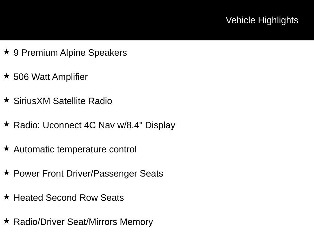 INCLUDES LIFETIME POWERTRAIN WARRANTY, REMAINDER OF FACTORY WARRANTY, CLEAN VEHICLE HISTORY...NO ACCIDENTS!, AWD, 506 Watt Amplifier, 8.4" Touchscreen Display Radio, 9 Premium Alpine Speakers, Adaptive Cruise Control w/Stop, Advanced Brake Assist, Apple CarPlay/Android Auto, Auto High Beam Headlamp Control, Automatic temperature control, Blind Spot & Cross Path Detection, Comfort Group, Dual-Pane Panoramic Sunroof, Front & Rear LED Map Pocket Lights, Full Speed FWD Collision Warn Plus, Google Android Auto, Heated Front Seats, Heated Second Row Seats, Heated Steering Wheel, Integrated Voice Command w/Bluetooth, Lane Departure Warning Plus, Leather Trimmed Bucket Seats, Leather w/Perforated Insert Bucket Seats, Navigation System, ParkView Rear Back-Up Camera, Popular Equipment Group, Power Front Driver/Passenger Seats, Power Multi Function Mirror Manual Fold, Power Tilt/Telescope Steering Column, Radio: Uconnect 4C Nav w/8.4" Display, Radio/Driver Seat/Mirrors Memory, Rain Sensitive Windshield Wipers, SafetyTec Plus Group, SiriusXM Satellite Radio, Ventilated Front Seats, Wheels: 19" x 7.5" Black Noise Painted.