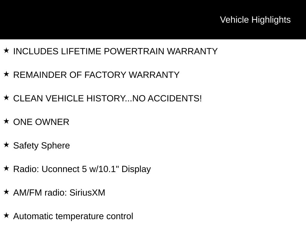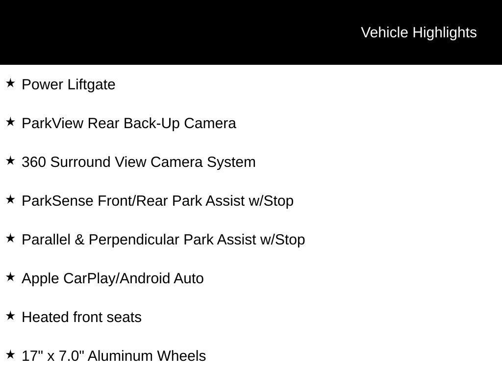 INCLUDES LIFETIME POWERTRAIN WARRANTY, REMAINDER OF FACTORY WARRANTY, CLEAN VEHICLE HISTORY...NO ACCIDENTS!, ONE OWNER, 17" x 7.0" Aluminum Wheels, 360 Surround View Camera System, AM/FM radio: SiriusXM, Apple CarPlay/Android Auto, Automatic temperature control, Heated front seats, Parallel & Perpendicular Park Assist w/Stop, ParkSense Front/Rear Park Assist w/Stop, ParkView Rear Back-Up Camera, Power Liftgate, Radio: Uconnect 5 w/10.1" Display, Safety Sphere.