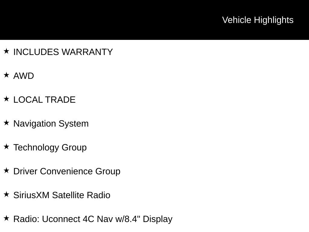INCLUDES WARRANTY, AWD, LOCAL TRADE, 8.4" Touchscreen Display Radio, Adaptive Speed Control, Apple CarPlay, Auto High Beam Headlamp Control, Automatic temperature control, Blind Spot & Cross Path Detection, Driver Convenience Group, Forward Collision Warning, Google Android Auto, Heated Front Seats, High-Intensity Discharge Headlamps, Integrated Voice Command w/Bluetooth, Leather Trim Seats, Nappa Leather Sport Seat, Navigation System, Power driver seat, Power Multi-Function Foldaway Mirrors, Radio: Uconnect 4C Nav w/8.4" Display, Rain Sensitive Windshield Wipers, Remote Start System, SiriusXM Satellite Radio, Technology Group, Ventilated Front Seats, Wheels: 19" x 7.5" Aluminum Painted Hyperblack.