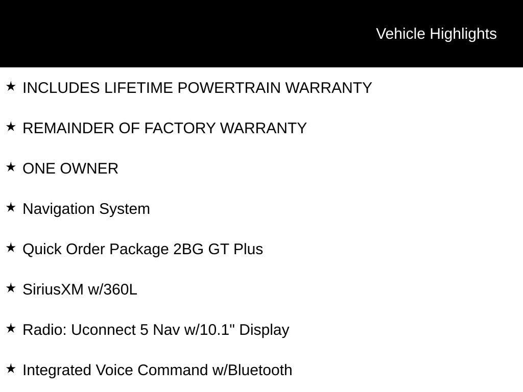 INCLUDES LIFETIME POWERTRAIN WARRANTY, REMAINDER OF FACTORY WARRANTY, ONE OWNER, 10.1" Touchscreen Display, 2nd Row Fold/Tumble Captain Chairs, 2nd Row Mini Console w/Cupholders, 2nd Row Seat Mounted Inboard Armrests, 6-Passenger Seating, Adaptive Cruise Control w/Stop, Alloy wheels, Apple CarPlay, Auto-Dimming Exterior Driver Mirror, Automatic temperature control, Blind Spot w/Trailer Detection, Dual Remote USB Port - Charge Only, Exterior Mirrors w/Heating Element, Exterior Mirrors w/Supplemental Signals, Full Speed Forward Collision Warning Plus, Gloss Black Exterior Mirrors, Google Android Auto, Heated Second Row Seats, Integrated Voice Command w/Bluetooth, Leather Trimmed Bucket Seats, Leather Wrapped Door Panels, LED Auxiliary Low Beam & Turn Signal, Navigation System, ParkView Rear Back-Up Camera, Power 6x9 Multi-Function Foldaway Mirrors, Power 8-Way Driver Memory 8-Way Passenger Seats, Power Driver/Passenger 4-Way Lumbar Adjust, Power Liftgate, Power Sunroof, Power Tilt & Telescopic Steering Column, Quick Order Package 2BG GT Plus, Radio: Uconnect 5 Nav w/10.1" Display, Radio/Driver Seat/Mirrors Memory, Red Accent Stitching, SiriusXM w/360L, Ventilated Front Seats, Wheels: 20" x 8.0" Fine Silver.