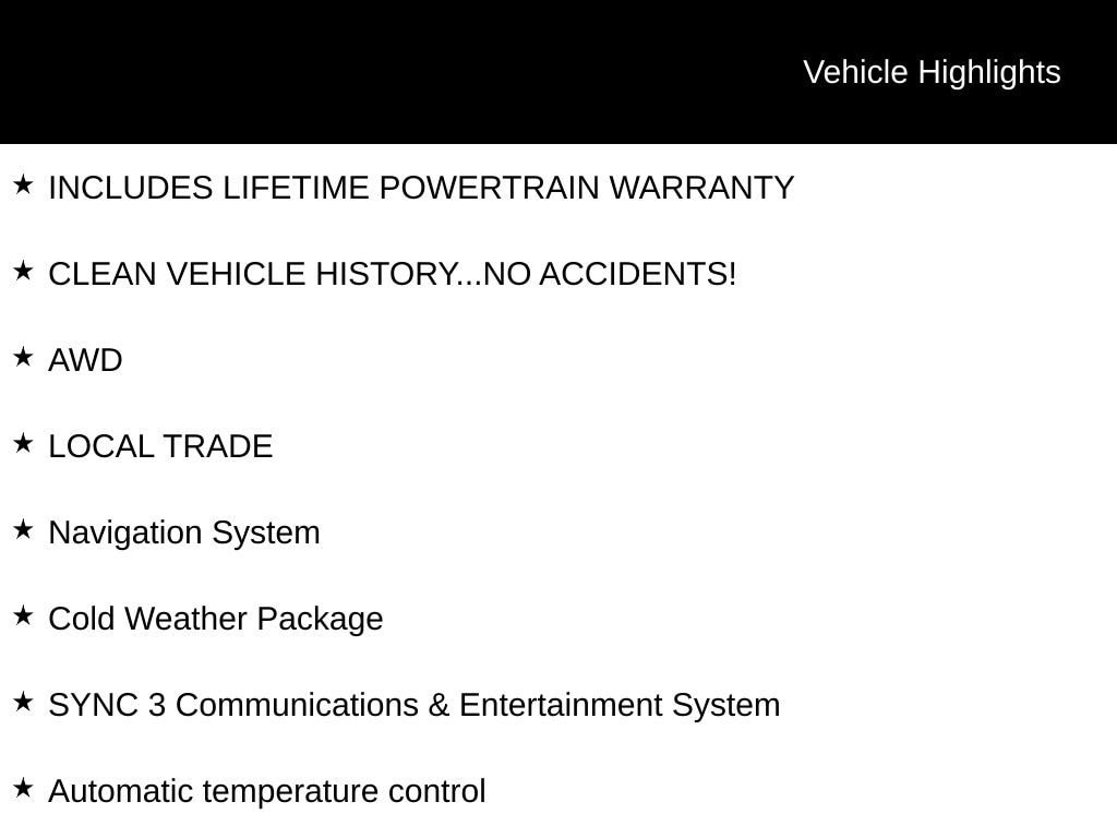 INCLUDES LIFETIME POWERTRAIN WARRANTY, CLEAN VEHICLE HISTORY...NO ACCIDENTS!, AWD, LOCAL TRADE, ActiveX Seating Material Heated Bucket Seats, Automatic temperature control, Cold Weather Package, Foot-Activated Hands-Free Liftgate, Heated front seats, Heated Steering Wheel, Navigation System, Power driver seat, SYNC 3 Communications & Entertainment System, Wheels: 18" Sparkle Silver-Painted Aluminum, Windshield Wiper De-Icer.