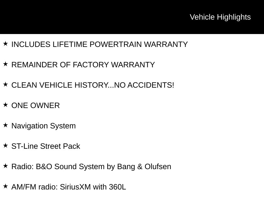 INCLUDES LIFETIME POWERTRAIN WARRANTY, REMAINDER OF FACTORY WARRANTY, CLEAN VEHICLE HISTORY...NO ACCIDENTS!, ONE OWNER, 4WD, AM/FM radio: SiriusXM with 360L, Apple CarPlay/Android Auto, Automatic temperature control, Exterior Parking Camera Rear, Heated front seats, Heated steering wheel, Navigation System, Performance Brakes, Power Liftgate, Radio: B&O Sound System by Bang & Olufsen, Red Painted Perf Front & Rear Brake Calipers, ST-Line Street Pack, Wheels: 21" Magnetite-Painted Aluminum.