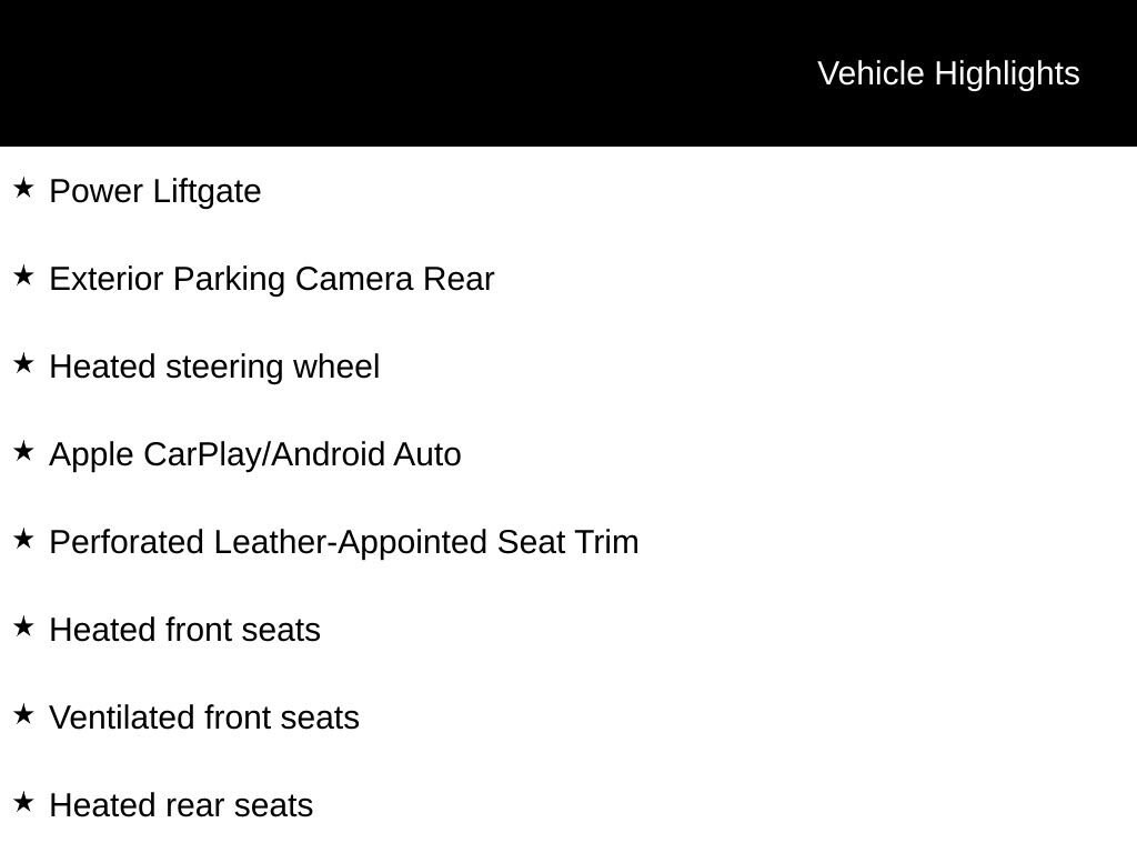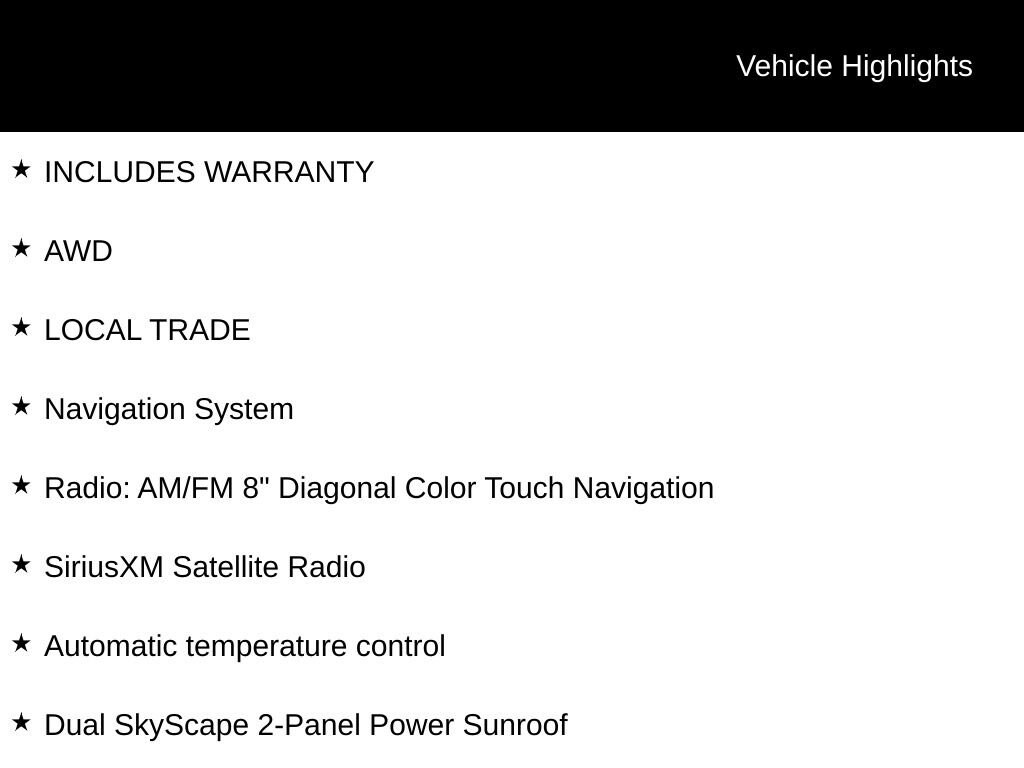 INCLUDES WARRANTY, AWD, LOCAL TRADE, Apple CarPlay/Android Auto, Automatic temperature control, Dual SkyScape 2-Panel Power Sunroof, Exterior Parking Camera Rear, Heated front seats, Heated rear seats, Heated steering wheel, Navigation System, Perforated Leather-Appointed Seat Trim, Power Liftgate, Radio: AM/FM 8 Diagonal Color Touch Navigation, SiriusXM Satellite Radio, Ventilated front seats, Wheels: 20 x 8 Polished Aluminum (4).