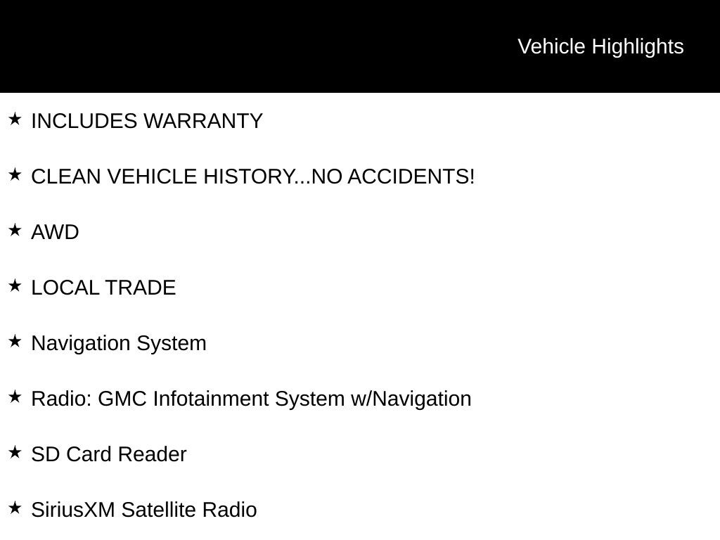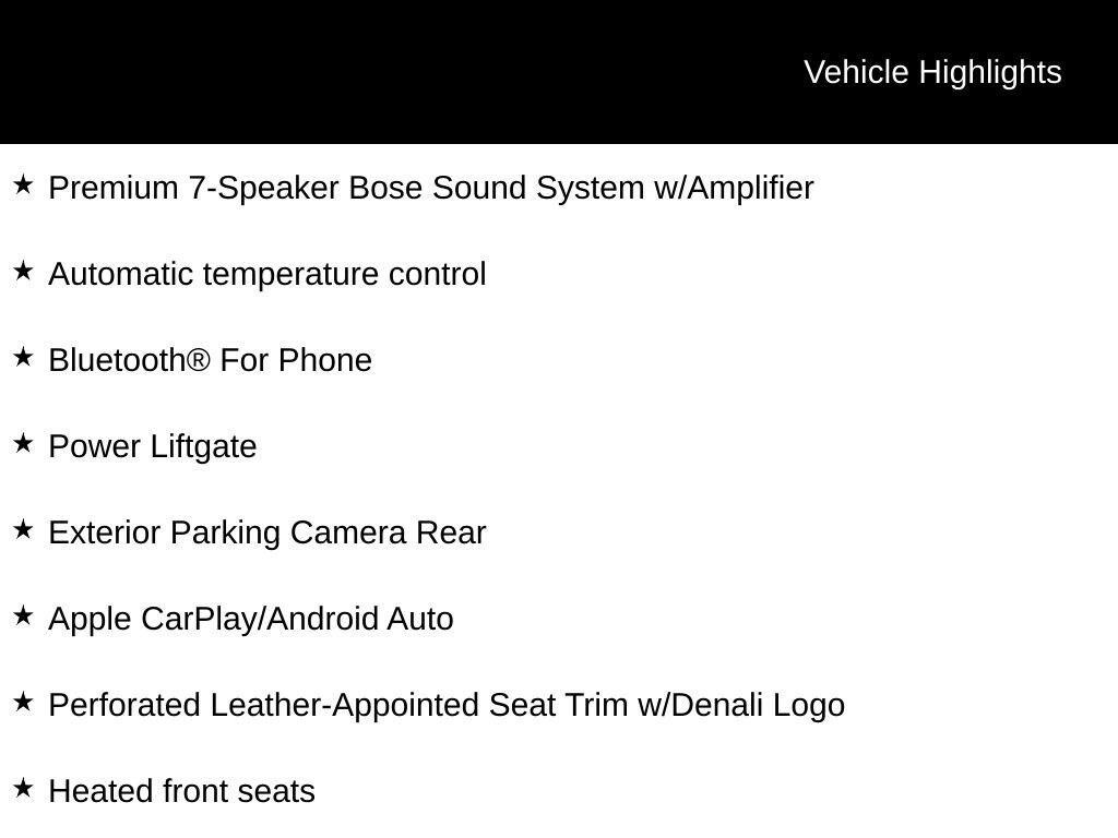 INCLUDES WARRANTY, CLEAN VEHICLE HISTORY...NO ACCIDENTS!, AWD, LOCAL TRADE, Apple CarPlay/Android Auto, Automatic temperature control, Bluetooth® For Phone, Exterior Parking Camera Rear, Heated front seats, Navigation System, Perforated Leather-Appointed Seat Trim w/Denali Logo, Power Liftgate, Premium 7-Speaker Bose Sound System w/Amplifier, Radio: GMC Infotainment System w/Navigation, SD Card Reader, SiriusXM Satellite Radio, Wheels: 19" x 7.5" Ultra-Bright Machined Aluminum.