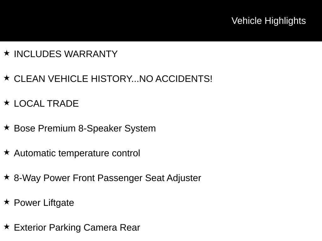 INCLUDES WARRANTY, CLEAN VEHICLE HISTORY...NO ACCIDENTS!, LOCAL TRADE, FWD, Jet Black Leather, 18 x 7.5 Aluminum (4) Wheels, 8-Way Power Front Passenger Seat Adjuster, Apple CarPlay/Android Auto, Automatic temperature control, Bose Premium 8-Speaker System, Exterior Parking Camera Rear, Front fog lights, Heated Driver & Front Passenger Seats, Perforated Leather-Appointed Seat Trim, Power Driver Lumbar Control Seat Adjuster, Power Liftgate, Power Passenger Lumbar Control Seat Adjuster.