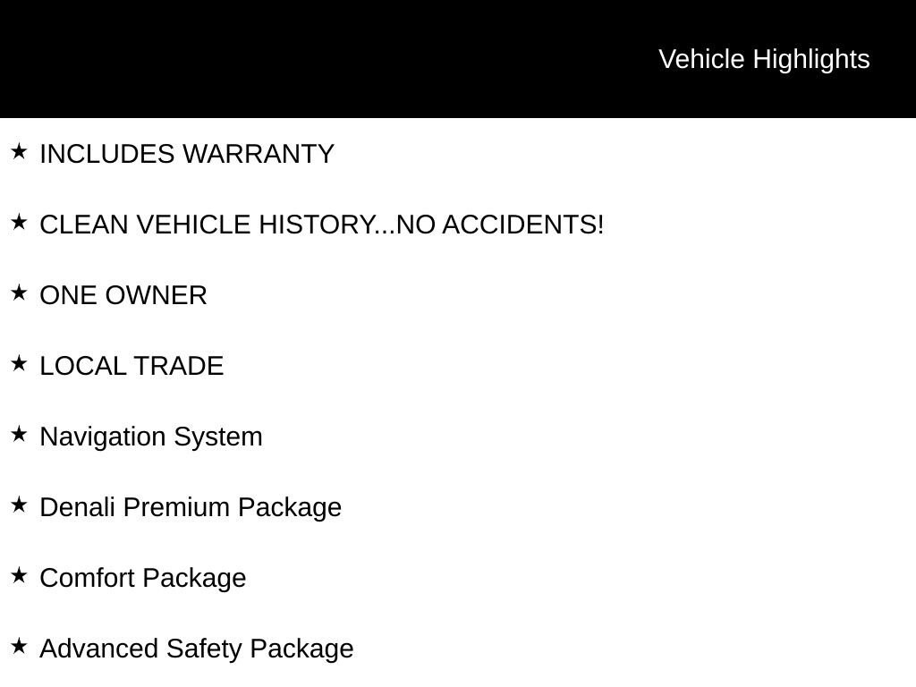 INCLUDES WARRANTY, CLEAN VEHICLE HISTORY...NO ACCIDENTS!, ONE OWNER, LOCAL TRADE, 2 USB Data Ports, Adaptive Cruise Control - Camera, Advanced Safety Package, Automatic Parking Assist, Automatic temperature control, Bluetooth® For Phone, Comfort Package, Denali Premium Package, HD Radio, HD Surround Vision, Heated Rear Outboard Seating Positions, Navigation System, Premium 7-Speaker Bose Sound System w/Amplifier, Radio: GMC Infotainment System w/Navigation, SiriusXM Radio, Ventilated Driver Seat, Ventilated Front Passenger Seat.Recent Arrival! 21/26 City/Highway MPGFor over 50 years, Tom Ahl has been committed to earning your business, trust and friendship by providing you with the greatest value in a vehicle for the lowest cost to you. We offer full disclosure with every vehicle by providing a complimentary Autocheck vehicle history report and a copy of repairs made following our extensive 72 point inspection. For a deal so good it'll knock your socks off, visit Tom Ahl's today!