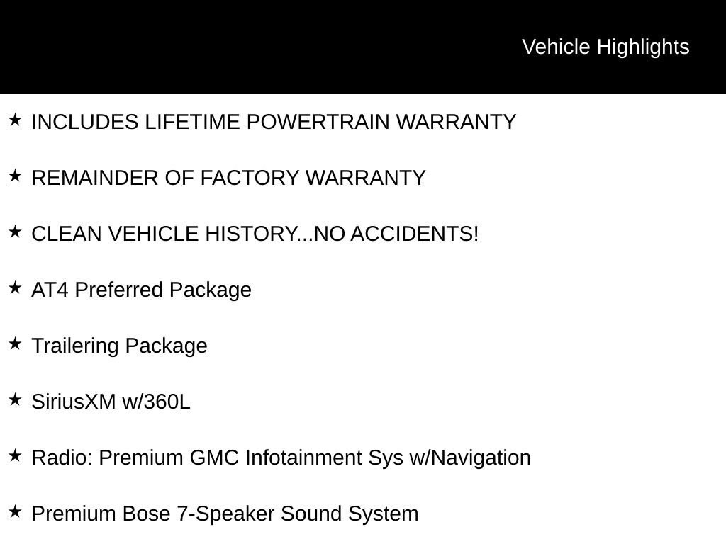 INCLUDES LIFETIME POWERTRAIN WARRANTY, REMAINDER OF FACTORY WARRANTY, CLEAN VEHICLE HISTORY...NO ACCIDENTS!, 4D Crew Cab, EcoTec3 6.2L V8, 4WD, 10-Way Power Driver Seat Adjuster w/Lumbar, Apple CarPlay/Android Auto, AT4 Preferred Package, Automatic temperature control, HD Rear Vision Camera, Heated Driver & Front Outboard Passenger Seating, Heated Steering Wheel, Hitch Guidance w/Hitch View, In-Vehicle Trailering App, Integrated Trailer Brake Controller, Perforated Front Leather Seat Trim, Power Sliding Rear Window w/Rear Defogger, Premium Bose 7-Speaker Sound System, Radio: Premium GMC Infotainment Sys w/Navigation, SiriusXM w/360L, Spray-On Pickup Bed Liner w/AT4 Logo, Trailering Package, Ventilated Driver & Front Passenger Seats, Wheels: 20 x 9 Machined Aluminum, Wireless Charging.Recent Arrival! Odometer is 23506 miles below market average!For over 50 years, Tom Ahl has been committed to earning your business, trust and friendship by providing you with the greatest value in a vehicle for the lowest cost to you. We offer full disclosure with every vehicle by providing a complimentary Autocheck vehicle history report and a copy of repairs made following our extensive 72 point inspection. For a deal so good it'll knock your socks off, visit Tom Ahl's today!