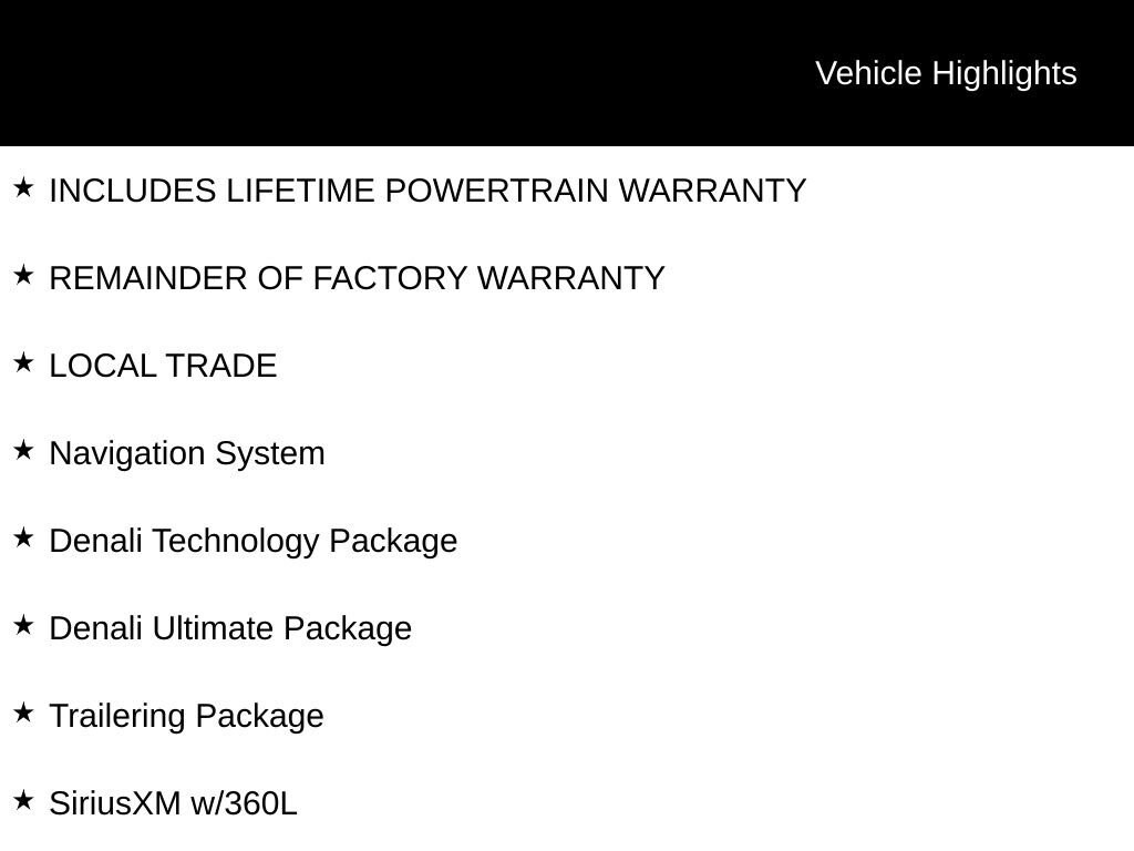 INCLUDES LIFETIME POWERTRAIN WARRANTY, REMAINDER OF FACTORY WARRANTY, LOCAL TRADE, Adaptive Cruise Control, Automatic temperature control, Bose Premium 8-Speaker Audio System Feature, Denali Technology Package, Denali Ultimate Package, Dual SkyScape 2-Panel Power Sunroof, Enhanced Automatic Emergency Braking, HD Surround Vision, Heavy-Duty Cooling System, Hitch Guidance w/Hitch View, Navigation System, Power Liftgate, Radio: AM/FM 8 Diagonal Multi-Touch Navigation, Rear Camera Mirror, Rear Camera Mirror Washer, SiriusXM w/360L, Trailering Assist Guidelines, Trailering Package, Wireless Apple CarPlay/Wireless Android Auto.Recent Arrival! 22/29 City/Highway MPGFor over 50 years, Tom Ahl has been committed to earning your business, trust and friendship by providing you with the greatest value in a vehicle for the lowest cost to you. We offer full disclosure with every vehicle by providing a complimentary Autocheck vehicle history report and a copy of repairs made following our extensive 72 point inspection. For a deal so good it'll knock your socks off, visit Tom Ahl's today!