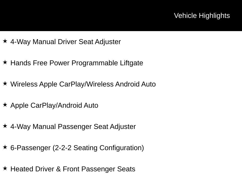 INCLUDES LIFETIME POWERTRAIN WARRANTY, REMAINDER OF FACTORY WARRANTY, CLEAN VEHICLE HISTORY...NO ACCIDENTS!, ONE OWNER, 4-Way Manual Driver Seat Adjuster, 4-Way Manual Passenger Seat Adjuster, 6-Passenger (2-2-2 Seating Configuration), 6-Speaker Audio System Feature, Apple CarPlay/Android Auto, Automatic temperature control, Hands Free Power Programmable Liftgate, Heated Driver & Front Passenger Seats, Radio: AM/FM w/8 Diagonal Multi-Touch Display, SiriusXM Radio, Wireless Apple CarPlay/Wireless Android Auto.