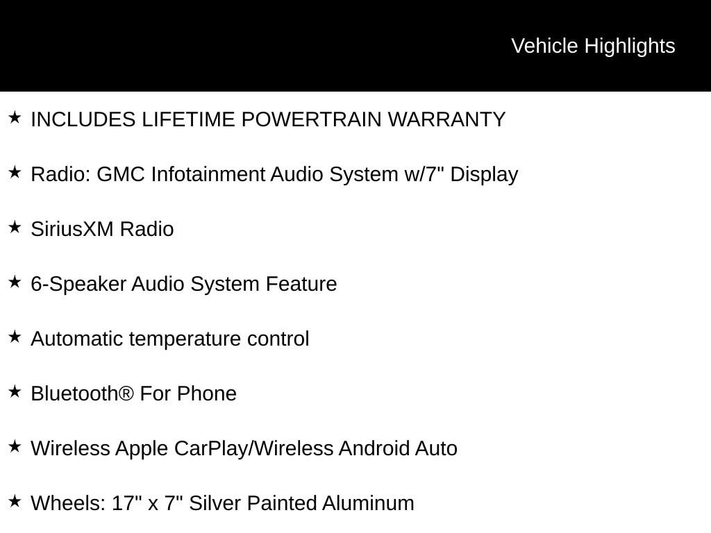 INCLUDES LIFETIME POWERTRAIN WARRANTY, 6-Speaker Audio System Feature, Automatic temperature control, Bluetooth® For Phone, Radio: GMC Infotainment Audio System w/7 Display, SiriusXM Radio, Wheels: 17 x 7 Silver Painted Aluminum, Wireless Apple CarPlay/Wireless Android Auto.