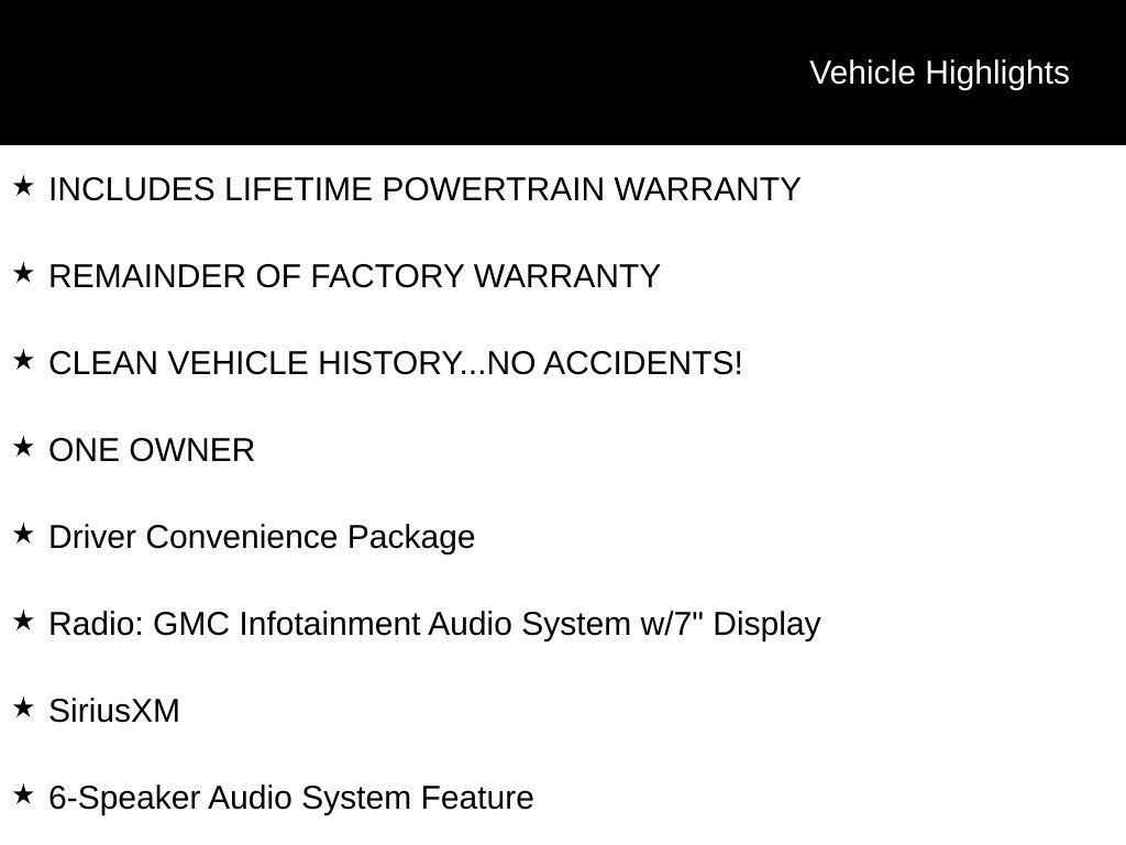 INCLUDES LIFETIME POWERTRAIN WARRANTY, REMAINDER OF FACTORY WARRANTY, CLEAN VEHICLE HISTORY...NO ACCIDENTS!, ONE OWNER, 6-Speaker Audio System Feature, 8-Way Power Driver Seat Adjuster, Bluetooth® For Phone, Driver & Front Passenger Heated Seats, Driver Convenience Package, Dual-Zone Automatic Climate Control, Power Driver Lumbar Control, Power Programmable Rear Liftgate, Radio: GMC Infotainment Audio System w/7 Display, Remote Start, Roof-Mounted Luggage Rack Side Rails, SiriusXM, Wheels: 17 x 7 Silver Painted Aluminum, Wireless Apple CarPlay/Wireless Android Auto.Recent Arrival! 24/29 City/Highway MPGFor over 50 years, Tom Ahl has been committed to earning your business, trust and friendship by providing you with the greatest value in a vehicle for the lowest cost to you. We offer full disclosure with every vehicle by providing a complimentary Autocheck vehicle history report and a copy of repairs made following our extensive 72 point inspection. For a deal so good it'll knock your socks off, visit Tom Ahl's today!