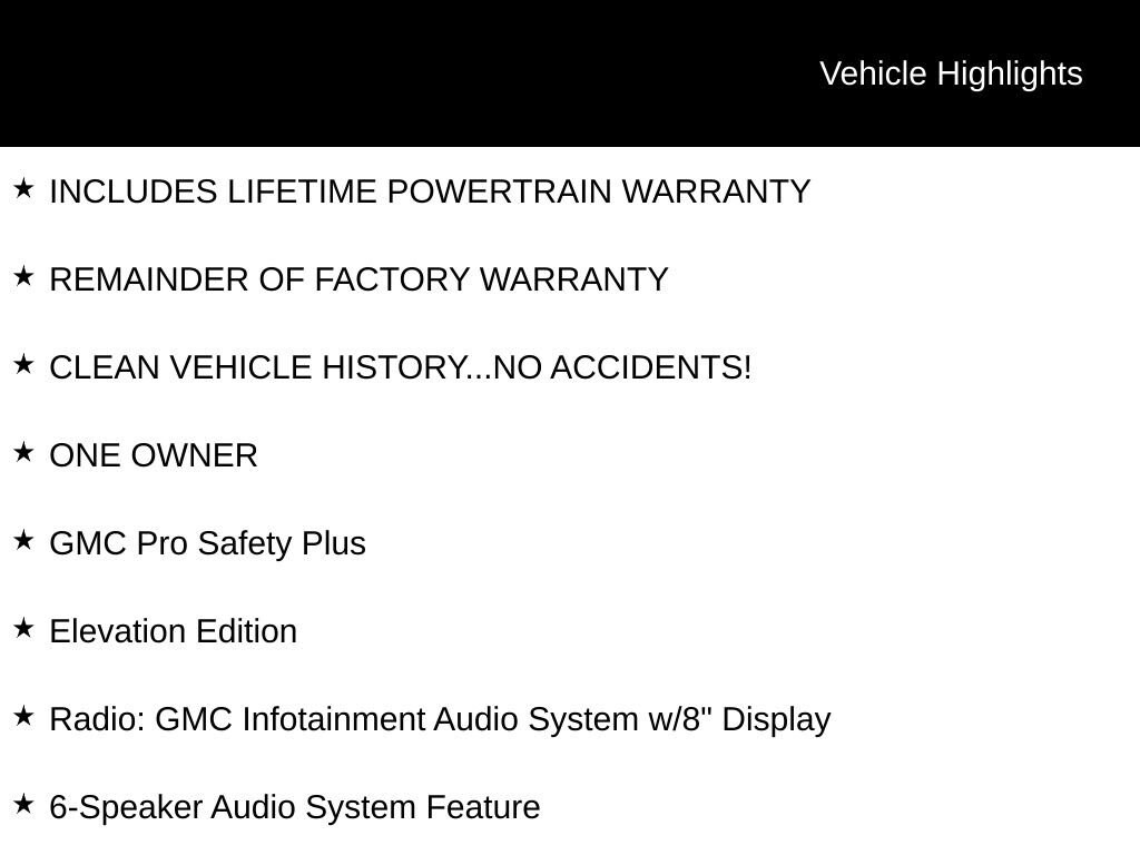 INCLUDES LIFETIME POWERTRAIN WARRANTY, REMAINDER OF FACTORY WARRANTY, CLEAN VEHICLE HISTORY...NO ACCIDENTS!, ONE OWNER, 6-Speaker Audio System Feature, 8-Way Power Driver Seat Adjuster, Adaptive Cruise Control, AM/FM radio: SiriusXM, Automatic temperature control, Black GMC Center Caps w/Red GMC Lettering, Bluetooth® For Phone, Driver & Front Passenger Heated Seats, Elevation Edition, GMC Pro Safety Plus, Heated steering wheel, Lane Change Alert w/Side Blind Zone Alert, Perforated Leather-Appointed Seat Trim, Power Driver Lumbar Control, Power Liftgate, Radio: GMC Infotainment Audio System w/8 Display, Rear Cross-Traffic Alert, Rear Park Assist, Roof-Mounted Luggage Rack Side Rails, Safety Alert Seat, Skyscape Power Sunroof w/Power Sunscreen, Wheels: 19 Gloss Black Aluminum, Wireless Apple CarPlay/Wireless Android Auto.Recent Arrival! 23/28 City/Highway MPG Odometer is 6219 miles below market average!For over 50 years, Tom Ahl has been committed to earning your business, trust and friendship by providing you with the greatest value in a vehicle for the lowest cost to you. We offer full disclosure with every vehicle by providing a complimentary Autocheck vehicle history report and a copy of repairs made following our extensive 72 point inspection. For a deal so good it'll knock your socks off, visit Tom Ahl's today!