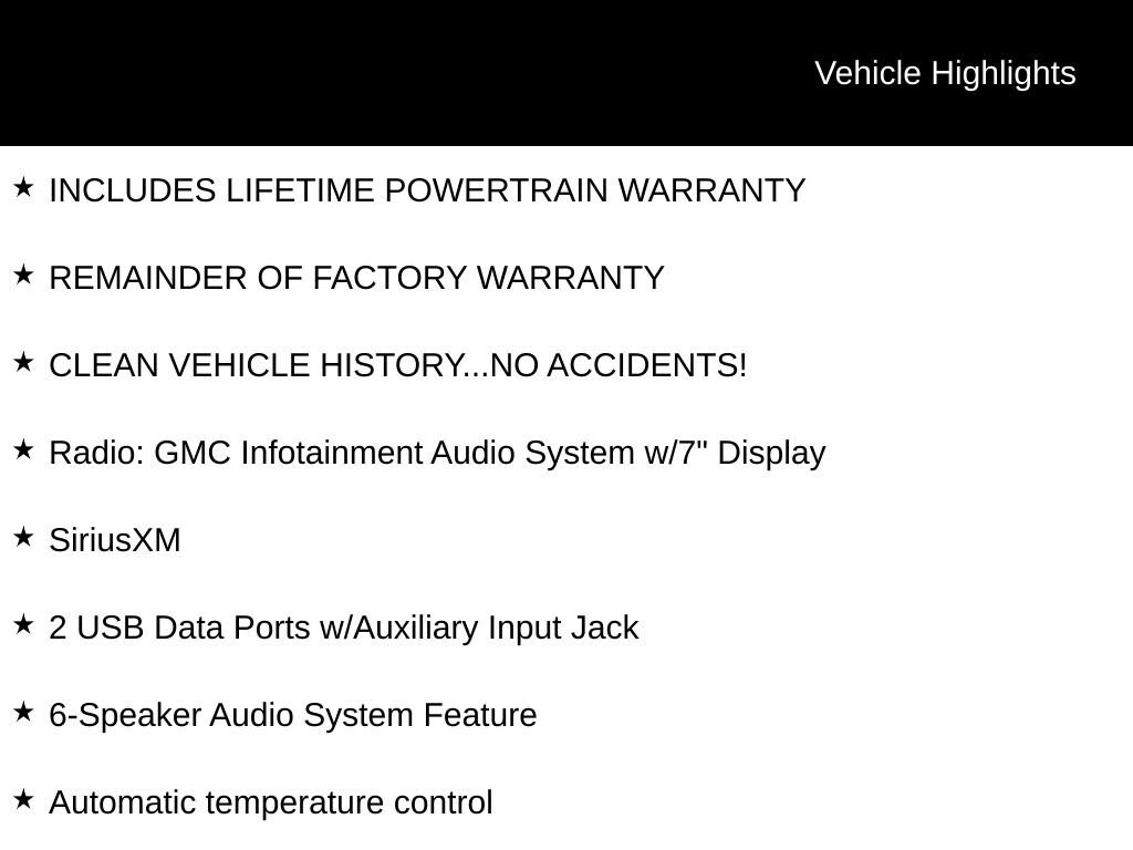 INCLUDES LIFETIME POWERTRAIN WARRANTY, REMAINDER OF FACTORY WARRANTY, CLEAN VEHICLE HISTORY...NO ACCIDENTS!, 2 USB Data Ports w/Auxiliary Input Jack, 6-Speaker Audio System Feature, Automatic temperature control, Bluetooth® For Phone, Radio: GMC Infotainment Audio System w/7 Display, SiriusXM, Wireless Apple CarPlay/Wireless Android Auto.