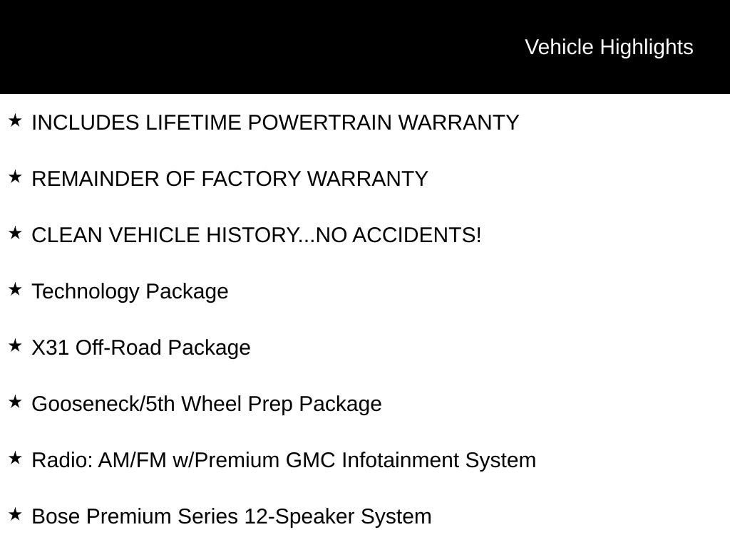 INCLUDES LIFETIME POWERTRAIN WARRANTY, REMAINDER OF FACTORY WARRANTY, CLEAN VEHICLE HISTORY...NO ACCIDENTS!, 4D Crew Cab, Duramax 6.6L V8 Turbodiesel, 4WD, Bose Premium Series 12-Speaker System, Gooseneck/5th Wheel Prep Package, Heated Driver & Front Outboard Passenger Seats, Inside Rearview Auto-Dimming Rear Camera Mirror, Lane Departure Warning System, Multicolor 15 Diagonal Head-Up Display, Power moonroof, Radio: AM/FM w/Premium GMC Infotainment System, Technology Package, Ventilated Driver & Front Passenger Seats, X31 Off-Road Package.