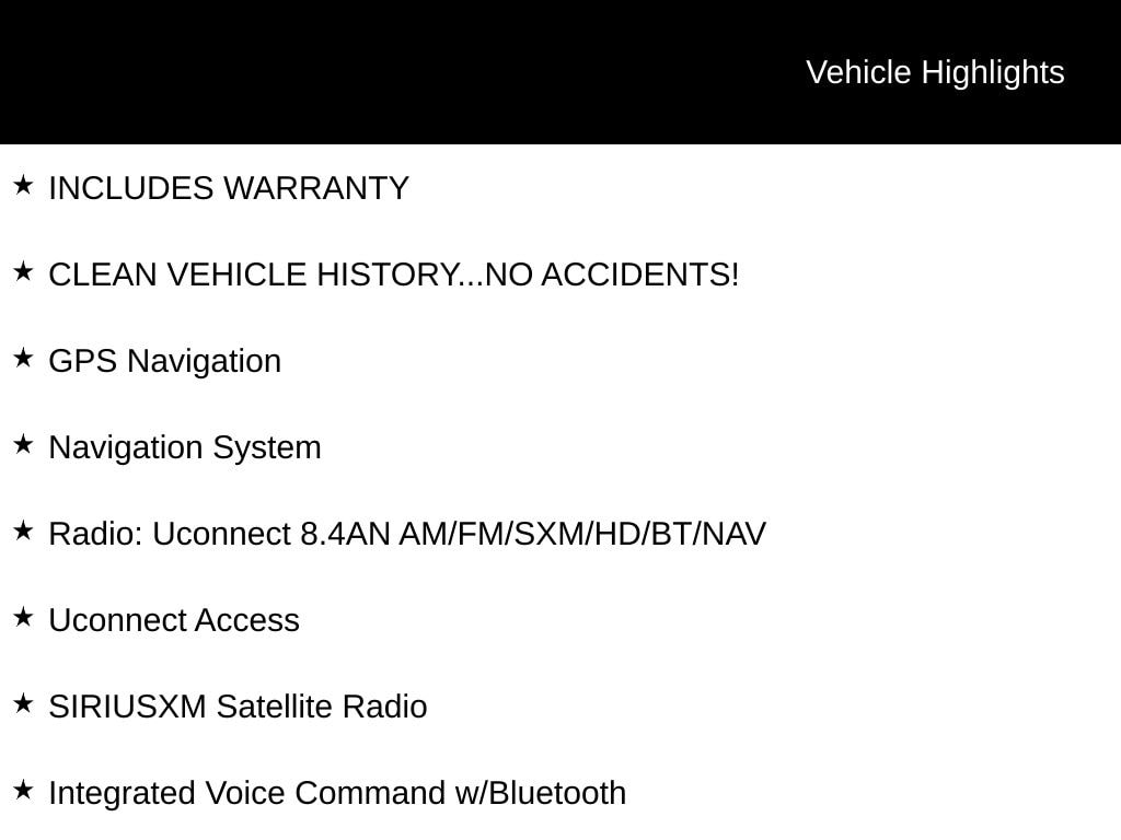 INCLUDES WARRANTY, CLEAN VEHICLE HISTORY...NO ACCIDENTS!, 4WD, 20" x 8.0" Aluminum Wheels, 8.4" Touchscreen Display Radio, AM/FM radio: SiriusXM, Automatic temperature control, Exterior Parking Camera Rear, GPS Navigation, Heated front seats, Heated rear seats, Heated steering wheel, Integrated Voice Command w/Bluetooth, Navigation System, Power Liftgate, Premium Leather Trimmed Bucket Seats, Radio: Uconnect 8.4AN AM/FM/SXM/HD/BT/NAV, Single Pane Power Sunroof, SIRIUSXM Satellite Radio, SIRIUSXM Traffic, SiriusXM Travel Link, Uconnect Access.