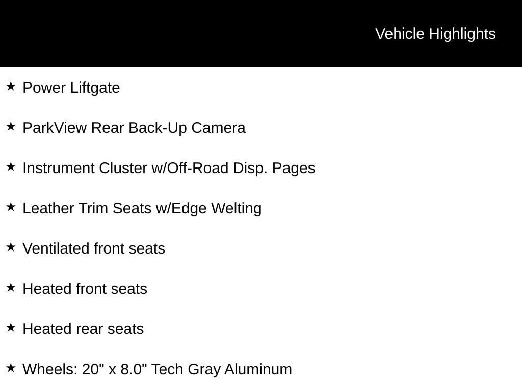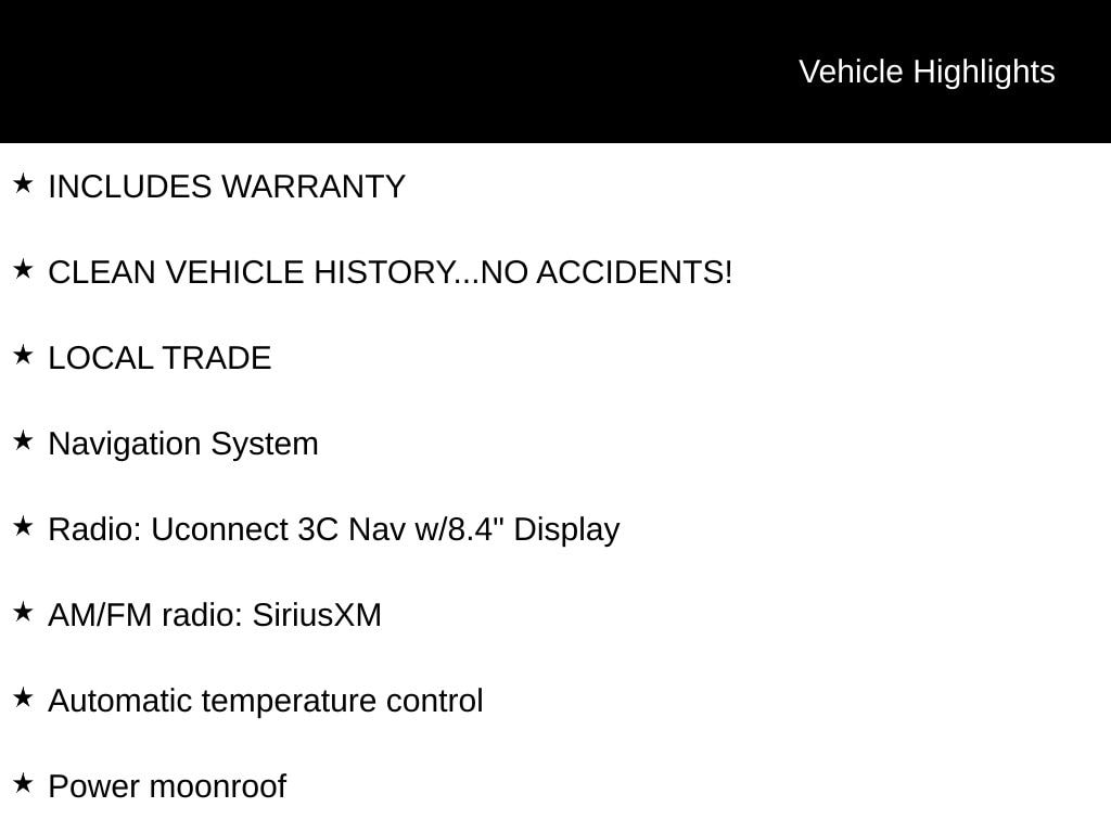 INCLUDES WARRANTY, CLEAN VEHICLE HISTORY...NO ACCIDENTS!, LOCAL TRADE, 4WD, AM/FM radio: SiriusXM, Automatic temperature control, Heated front seats, Heated rear seats, Instrument Cluster w/Off-Road Disp. Pages, Leather Trim Seats w/Edge Welting, Navigation System, ParkView Rear Back-Up Camera, Power Liftgate, Power moonroof, Radio: Uconnect 3C Nav w/8.4" Display, Ventilated front seats, Wheels: 20" x 8.0" Tech Gray Aluminum.