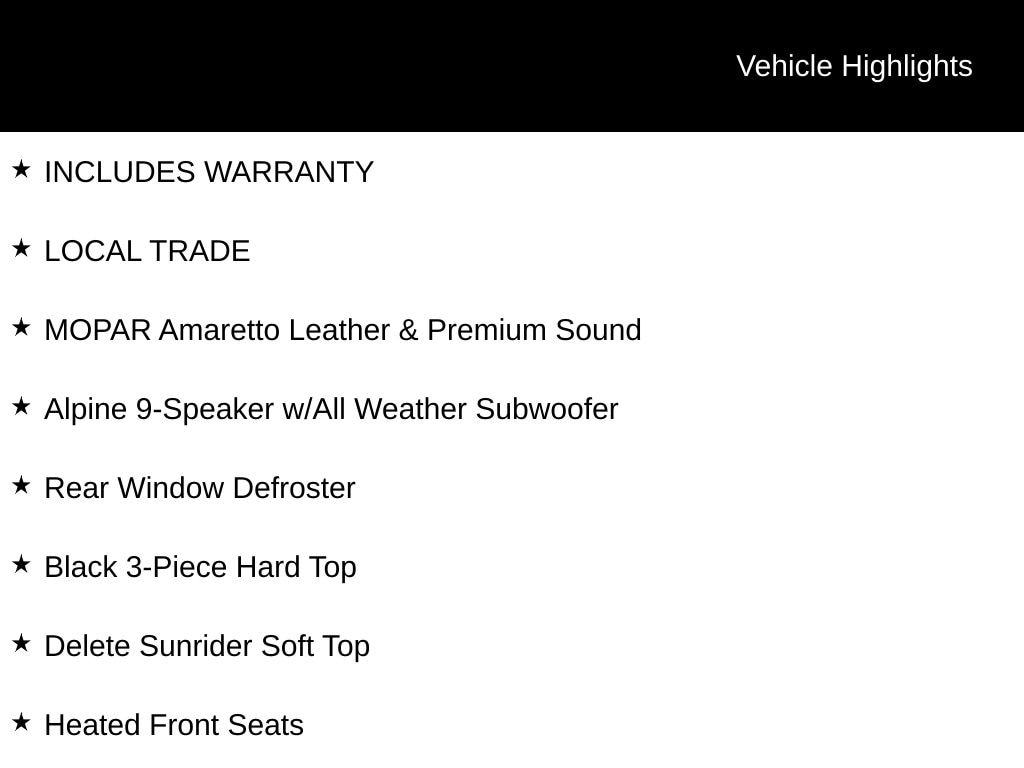 INCLUDES WARRANTY, LOCAL TRADE, 4WD, 18" x 7.5" Polished Satin Carbon Wheels, Alpine 9-Speaker w/All Weather Subwoofer, Black 3-Piece Hard Top, Delete Sunrider Soft Top, Freedom Panel Storage Bag, Heated Front Seats, MOPAR Amaretto Leather & Premium Sound, Rear Window Defroster, Rear Window Wiper/Washer.