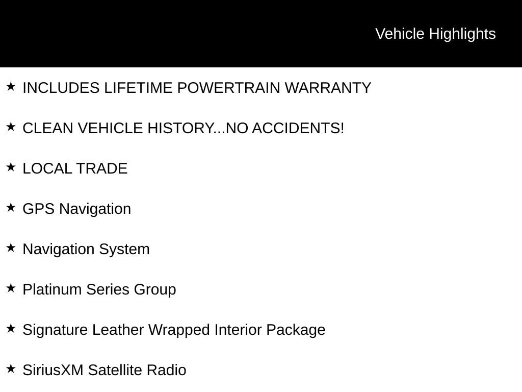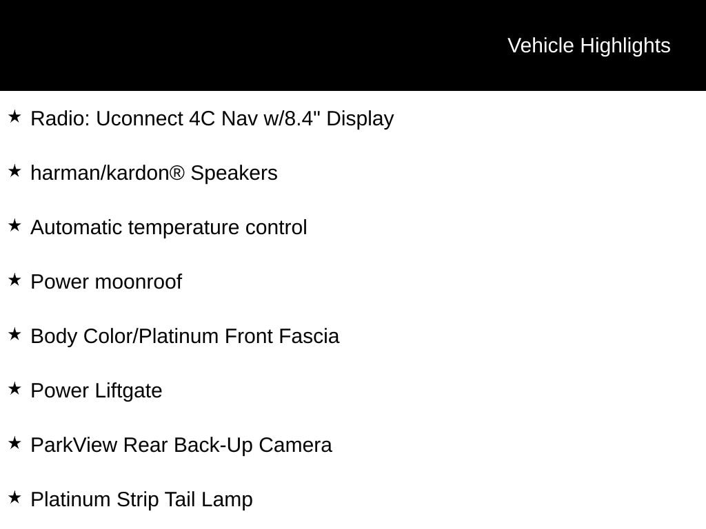 INCLUDES LIFETIME POWERTRAIN WARRANTY, CLEAN VEHICLE HISTORY...NO ACCIDENTS!, LOCAL TRADE, 4WD, 8.4" Touchscreen Display Radio, Apple CarPlay, Automatic temperature control, Body Color Door Handles, Body Color Exterior Mirrors, Body Color Sills w/Platinum, Body Color/Platinum Front Fascia, Body Color/Platinum Rear Fascia, Gloss Black Grille-Platinum Chrome, Google Android Auto, GPS Navigation, harman/kardon® Speakers, Heated front seats, Heated rear seats, Integrated Voice Command w/Bluetooth, Leather Trimmed Bucket Seats, Leather Wrapped Lower Panels, Navigation System, ParkView Rear Back-Up Camera, Platinum Day Light Opening Moldings, Platinum Exterior Badging, Platinum Series Group, Platinum Side Roof Rails, Platinum Strip Tail Lamp, Power Liftgate, Power moonroof, Premium Laguna Leather Seats, Radio: Uconnect 4C Nav w/8.4" Display, Signature Leather Wrapped Interior Package, SiriusXM Satellite Radio, Ventilated front seats, Wheels: 20" x 8.0" Platinum Aluminum.