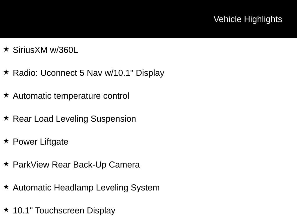 INCLUDES LIFETIME POWERTRAIN WARRANTY, CLEAN VEHICLE HISTORY...NO ACCIDENTS!, ONE OWNER, LOCAL TRADE, 4WD, 10.1" Touchscreen Display, 506 Watt Amplifier, 9 Amplified Speakers w/Subwoofer, Apple CarPlay/Android Auto, Automatic Headlamp Leveling System, Automatic temperature control, Heated front seats, Heated rear seats, Heated steering wheel, Integrated Voice Command w/Bluetooth, Navigation System, ParkView Rear Back-Up Camera, Power Liftgate, Radio: Uconnect 5 Nav w/10.1" Display, Rear Load Leveling Suspension, SiriusXM w/360L, Trailer Hitch Zoom, Trailer Tow Group (B) (DISC), Wheels: 20" x 8.5" Polished/Painted Aluminum (DISC).