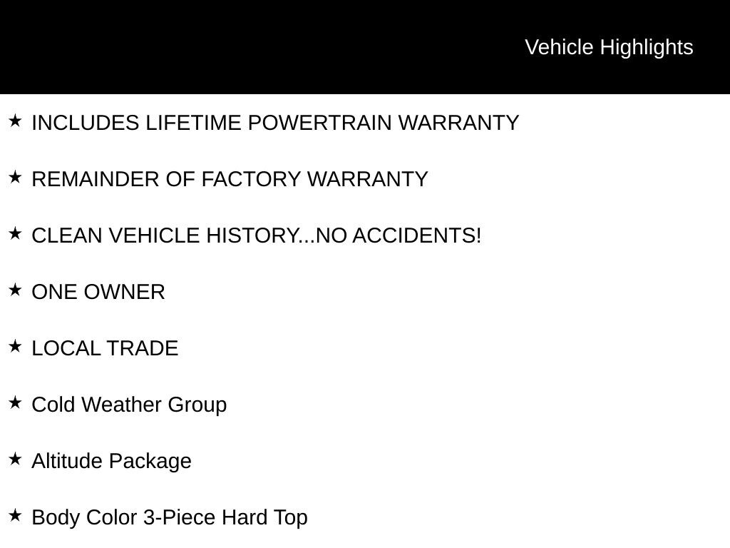 INCLUDES LIFETIME POWERTRAIN WARRANTY, REMAINDER OF FACTORY WARRANTY, CLEAN VEHICLE HISTORY...NO ACCIDENTS!, ONE OWNER, LOCAL TRADE, 3.6L V6 24V VVT, 4WD, Altitude Package, AM/FM radio: SiriusXM, Apple CarPlay, Automatic temperature control, Body Color 3-Piece Hard Top, Cold Weather Group, Google Android Auto, Heated Front Seats, Heated Steering Wheel, ParkView Rear Back-Up Camera, Wheels: 18" x 7.5" Gloss Black Aluminum.
