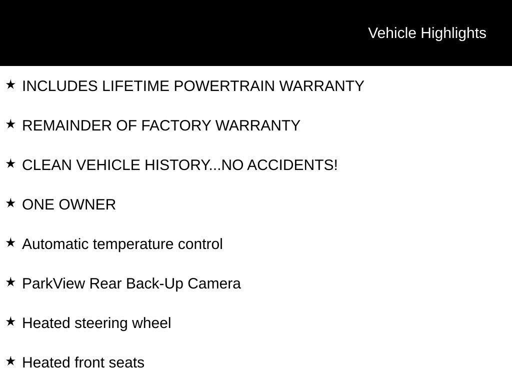 INCLUDES LIFETIME POWERTRAIN WARRANTY, REMAINDER OF FACTORY WARRANTY, CLEAN VEHICLE HISTORY...NO ACCIDENTS!, ONE OWNER, 4WD, Automatic temperature control, Heated front seats, Heated steering wheel, ParkView Rear Back-Up Camera, Wheels: 18" x 7" Painted Diamond Cut Aluminum.