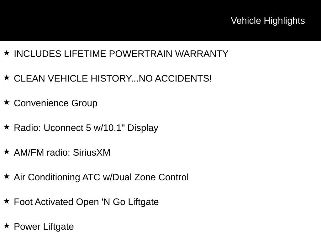INCLUDES LIFETIME POWERTRAIN WARRANTY, CLEAN VEHICLE HISTORY...NO ACCIDENTS!, 4WD, 17" x 7.0" Aluminum Wheels, Air Conditioning ATC w/Dual Zone Control, AM/FM radio: SiriusXM, Convenience Group, Foot Activated Open 'N Go Liftgate, Heated Front Seats, Heated Steering Wheel, ParkView Rear Back-Up Camera, Power Adjust 8-Way Driver Seat, Power Liftgate, Radio: Uconnect 5 w/10.1" Display.