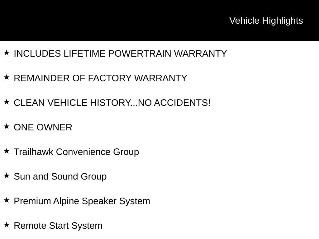 Priced below KBB Fair Purchase Price! INCLUDES LIFETIME POWERTRAIN WARRANTY, REMAINDER OF FACTORY WARRANTY, CLEAN VEHICLE HISTORY...NO ACCIDENTS!, ONE OWNER, 4WD, 2nd Row USB Type A/C Charge Only, Heated Front Seats, Heated Steering Wheel, ParkView Rear Back-Up Camera, Power 2-Way Driver Lumbar Adjust, Power Front/Fixed Rear Full Sunroof, Premium Alpine Speaker System, Remote Start System, Reversible Carpet/Vinyl Cargo Mat, Sun and Sound Group, Trailhawk Convenience Group, Windshield Wiper De-Icer.