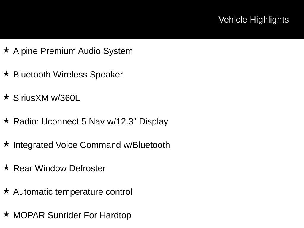 INCLUDES LIFETIME POWERTRAIN WARRANTY, REMAINDER OF FACTORY WARRANTY, CLEAN VEHICLE HISTORY...NO ACCIDENTS!, ONE OWNER, 4WD, 12.3" Touchscreen Display, Alexa Built-In, Alpine Premium Audio System, Apple CarPlay, Auto High Beam Headlamp Control, Automatic temperature control, Blind Spot & Cross Path Detection, Bluetooth Wireless Speaker, Body Color 3-Piece Hard Top, Body Color Rubicon Highline Flare, Emergency/Assistance Call, Google Android Auto, Heated Front Seats, Heated Steering Wheel, Integrated Voice Command w/Bluetooth, Leather Trimmed Bucket Seats, Leather Wrapped Park Brake Handle, Leather Wrapped Shift Knob, Mojave X Package, MOPAR Hard Tri-Fold Tonneau Cover, MOPAR Hardtop Headliner, MOPAR Sunrider For Hardtop, Navigation System, No Soft Top, ParkSense Rear Park Assist System, Power Adjust 8-Way Driver Seat, Power Adjust 8-Way Front Passenger Seat, Quick Order Package 24A Mojave X, Radio: Uconnect 5 Nav w/12.3" Display, Rear Sliding Window, Rear Window Defroster, Rock Protection Sill Rails, SiriusXM w/360L, Steel Front Bumper, Steel Rear Bumper, Wheels: 17" x 7.5" Machined/Painted Dark Gray.