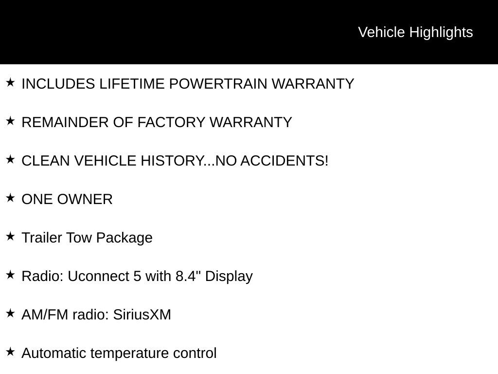 INCLUDES LIFETIME POWERTRAIN WARRANTY, REMAINDER OF FACTORY WARRANTY, CLEAN VEHICLE HISTORY...NO ACCIDENTS!, ONE OWNER, 4WD, 180 Amp Alternator, 7 and 4-Pin Wiring Harness, Altitude X, AM/FM radio: SiriusXM, Automatic Headlamp Levelling System, Automatic temperature control, Class IV Receiver Hitch, Heated Front Seats, ParkView Rear Back-Up Camera, Power driver seat, Power Liftgate, Power Sunroof, Radio: Uconnect 5 with 8.4" Display, Trailer Hitch Zoom, Trailer Tow Package, Wheels: 20" x 8.5" Gloss Black Painted Aluminum.
