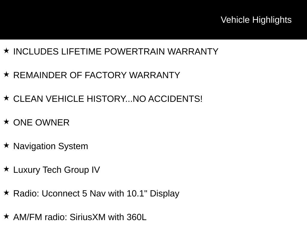 INCLUDES LIFETIME POWERTRAIN WARRANTY, REMAINDER OF FACTORY WARRANTY, CLEAN VEHICLE HISTORY...NO ACCIDENTS!, ONE OWNER, 4WD, 12-Way Power Adjust Driver Seat, 12-Way Power Adjust Front Passenger Seat, 2nd-Row Manual Window Shades, AM/FM radio: SiriusXM with 360L, Automatic temperature control, Luxury Tech Group IV, Nappa Leather Seats, Navigation System, Passenger Seat Memory, Power Driver Seatback Massage, Power Front Passenger Seatback Massage, Power Liftgate, Power moonroof, Radio: Uconnect 5 Nav with 10.1" Display, Rearview Autodim Digital Display Mirror, Wheels: 20" x 8.5" Machined Face Aluminum, Wireless Charging Pad.