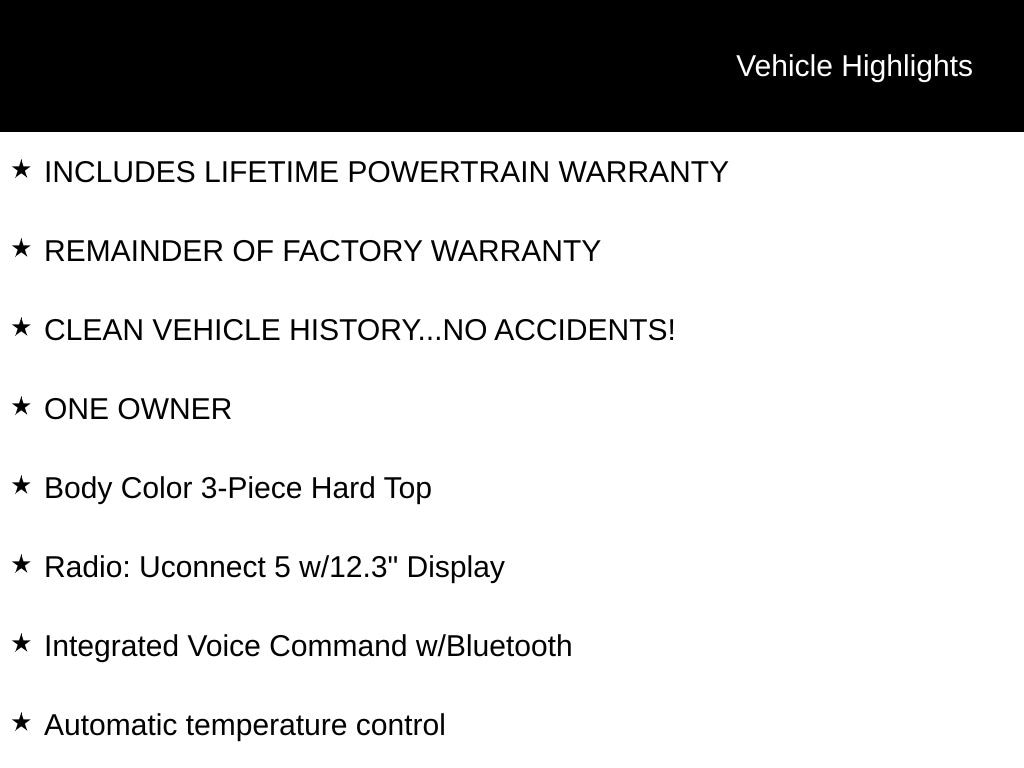 Priced below KBB Fair Purchase Price! INCLUDES LIFETIME POWERTRAIN WARRANTY, REMAINDER OF FACTORY WARRANTY, CLEAN VEHICLE HISTORY...NO ACCIDENTS!, ONE OWNER, 4WD, Apple CarPlay/Android Auto, Automatic temperature control, Body Color 3-Piece Hard Top, Freedom Panel Storage Bag, Heated steering wheel, Integrated Voice Command w/Bluetooth, ParkView Rear Back-Up Camera, Radio: Uconnect 5 w/12.3" Display, Rear Window Wiper/Washer, Wheels: 20" x 8" Painted Black Aluminum.